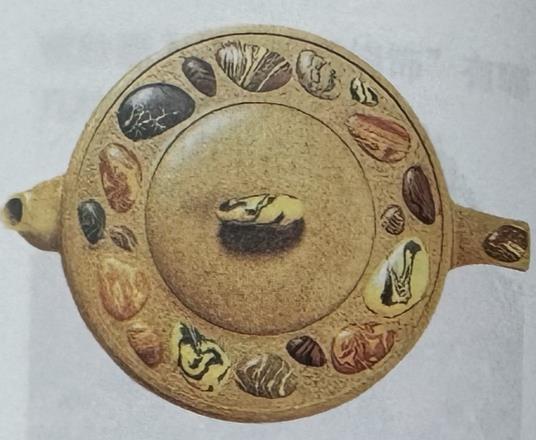 Ấm “Hoa Kính” (华径) mô phỏng đá mưa hoa, dùng đất giảo thai nặn thành viên đá ngũ sắc, khảm thành lối đi hoa trên vai ấm;