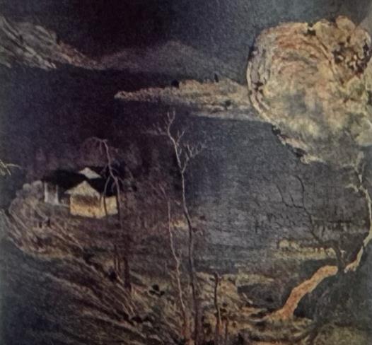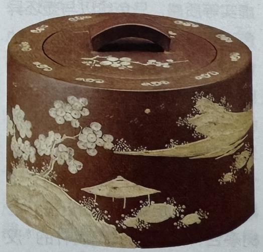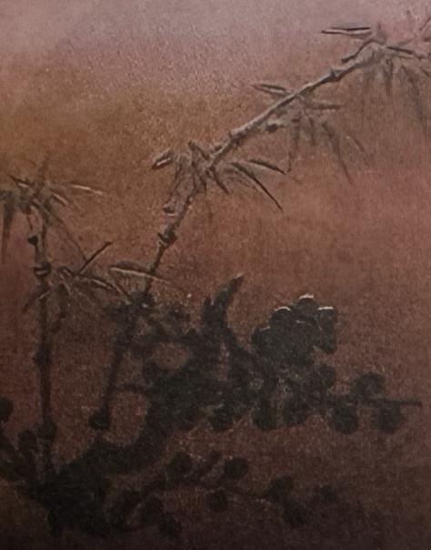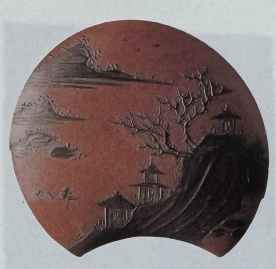 • “Khước Nguyệt” của Trần Mạn Sinh (陈曼生): Trên nền đất hồng nâu, dùng hồ đất đen vẽ núi non trùng điệp, xa gần rõ rệt, cây cổ đình đài, lớp lớp phân minh.