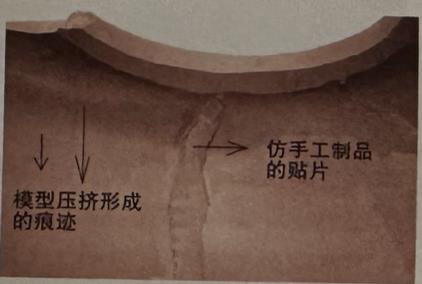 ▲ Bên trong ấm kết hợp khuôn có thể thấy vết ép (mép ấm) và vết dán (dọc thân) bắt chước làm thủ công