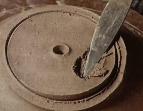 Dùng bàn xoay để khắc thành vòng tròn ở miệng nắp.