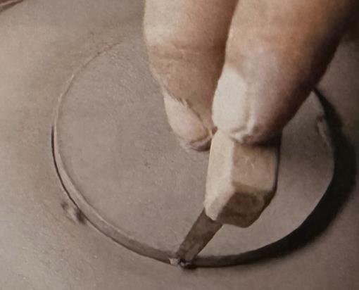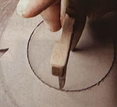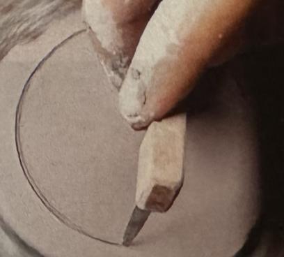 Dùng thước theo đúng thiết kế để rạch ra các mảnh đất dùng cho từng bộ phận của ấm tròn.