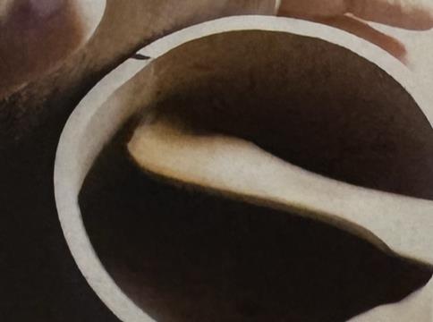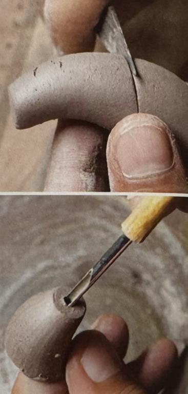 • ▲ 用通嘴尖刀插入毛坯壶流中心…: Dùng dao nhọn thông miệng đâm vào trung tâm phần vòi ấm thô, quét đất để tạo thành vách trong vòi ấm, rồi dùng tay chỉnh hình dạng cong.