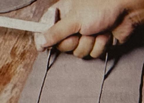 Sau khi gắn xong đáy giả, lật lại thân giản. Ở vị trí cần chuyển tiếp độ cong, thoa một lớp “chất dính mỡ” (脂泥) dày hơn, dùng dao tre để sửa nhẹ cho đều. Chờ đến khi khô vừa phải thì tiếp tục công đoạn sau.