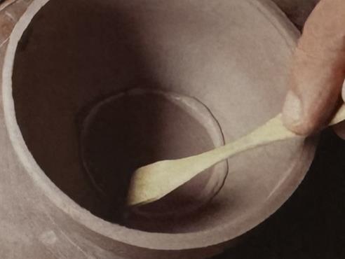 Dùng dụng cụ tre, theo chiều thuận tay, gọt đáy và thành bên trong ấm, tạo bề mặt nhẵn, xoá vết nối bùn đất, nén chặt lớp bên trong.