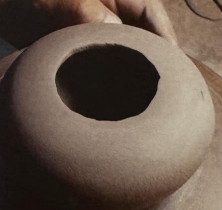 (7) Dùng ống trúc có đường kính khoảng 1 cm, cạnh vát theo độ cong mong muốn, đặt lên đất vành miệng rồi xoay qua lại để tạo miệng ấm.
