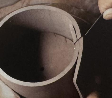 Dùng “chiết bùn” dán đáy vào miệng dưới thân ống, sau đó dùng tháp tử đập chặt đều. Dùng dao gọt mối nối cho phẳng.