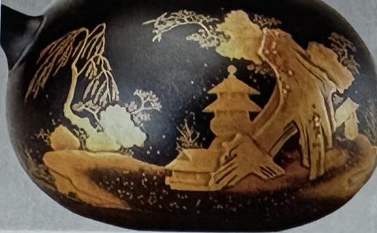 • Ấm “Tử sa hắc sơn miêu kim – Cát khánh hữu dư” (紫砂黑漆描金吉庆有余壶): bên trong là thân tử sa, bên ngoài phủ sơn đen, dùng sơn màu vàng, đỏ, vàng chanh vẽ cá song sinh, linh chi, ngọc hành, dơi – tạo thành bố cục họa tiết cát tường với ý nghĩa “phúc lành dư dả quanh năm”.