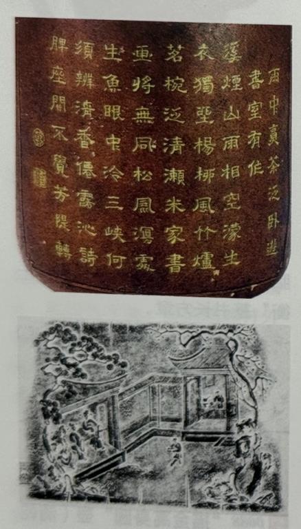 Mặt còn lại là phần in nổi vẽ bùn với đề tài “Đình Viện Tĩnh Trà Đồ” (庭院煎茶图), mô tả cảnh viện yên tĩnh trên núi, trong nhà có chủ nhân tiếp đãi khách cao sĩ luận trà, đánh cầm, đồng tử giúp việc bưng cầm qua, phía sau lò lửa có một đồng tử khác quạt gió đun nước. Cảnh tượng tinh tế, sinh động.