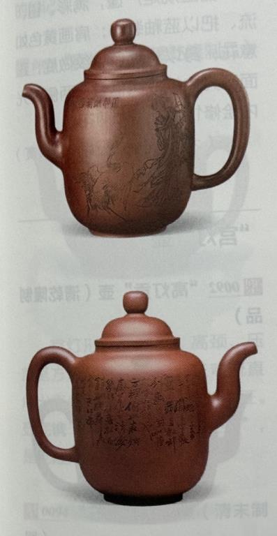 Thân phủ lớp áo màu chu đỏ (朱红色浆衣) trên nền đất tử sa màu vàng nhạt, nơi mài mòn lộ ra màu đất nguyên. Một mặt bụng ấm được mài bóng hình chữ nhật dọc, vẽ kim họa lại bài thơ của vua Càn Long (乾隆帝) trong “Vũ Trung Tĩnh Tọa Du Du Thư” (雨中寂寂泛卧游书查看作):