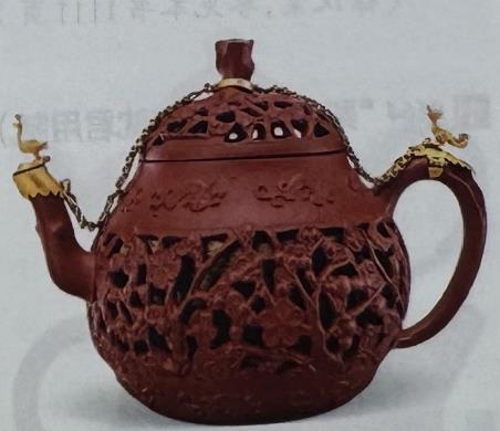 🔹 "Lộng Không Điêu Mai Hoa Văn Lê Hình" Hồ (镂空雕梅花纹梨形壶)Thông tin: Sản phẩm thời Thanh - niên hiệu Càn Long (清乾隆年制品).Mô tả:Thân và nắp đều được lộng không thấu điêu (镂空透雕 - chạm lộng xuyên suốt) hình hoa mai.Núm nắp (cái điền - 盖钿) đắp nổi thân cây mai (mai can - 梅干), uốn khúc vươn ra vài nhánh hoa.Quai và vòi đều được tạo hình thành cành cây mai.Phía trên và dưới thân ấm trang trí hai hàng đồ án li long (螭龙 - rồng không sừng).Trên vòi, núm và quai có khảm lưu kim ngân (鎏金银 - vàng bạc mạ) được phối hợp sau này, hai đầu (vòi và quai) mỗi bên đắp nổi hình chim đứng (lập điêu - 立雕), giữa nối với nhau bằng dây xích.
