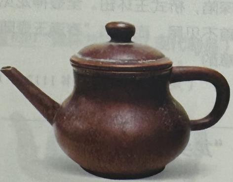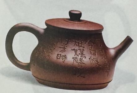 Kiểu ấm tương tự ấm “Hồ Thân” (芦身壶) của Thời Bằng (时朋). Nắp đè như nón lá, đỉnh phẳng. Vòi dài như ống trúc, nhô cao. Quai tròn như tai, nhô lên và cong. Thân ấm có khắc chữ Triện nhỏ (Tiểu Triện - Xiǎo Zhuàn) của Tôn Đỉnh (孙鼎), lạc khoản khắc chìm: “Khổ tích phồn hoa kim nhật hận, thùy môi thanh vãn thảo phương thời” (苦昔繁华今日恨, 谁媒声晚草芳时 - Đau khổ vì phồn hoa xưa là mối hận hôm nay, tiếng chim muộn màng nhờ ai báo hiệu thời cỏ thơm). Giải nghĩa xem thêm trang 1006 sách này