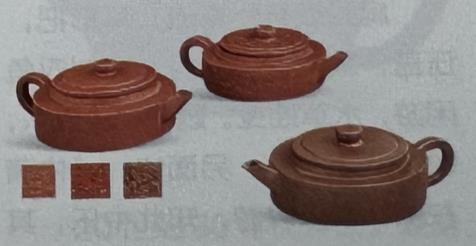 Một bộ gồm 3 ấm giống kiểu dáng, làm từ 3 loại đất tử sa khác nhau. Dáng thân tròn dẹt, vai phẳng, cổ đứng, nắp ép, núm tròn phẳng. Nắp phẳng khắc chỉ tuyến, vòi thẳng, quai tròn mang hơi hướng vuông, phối hợp với thân tạo sự chuyển đổi phẳng – rõ đường góc cạnh, lấy tròn làm chính, gợi vuông trong tròn. Đáy ấm khắc nhàn chương: “Bế môn tức thị thâm sơn” (闭门即是深山). Xem giải thích ở trang 1024.