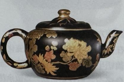 Ấm “Hắc Thất Miêu Kim Cúc Hoa” (黑漆描金菊花壶) – Thanh • Càn Long niên gian (清 • 乾隆年间)