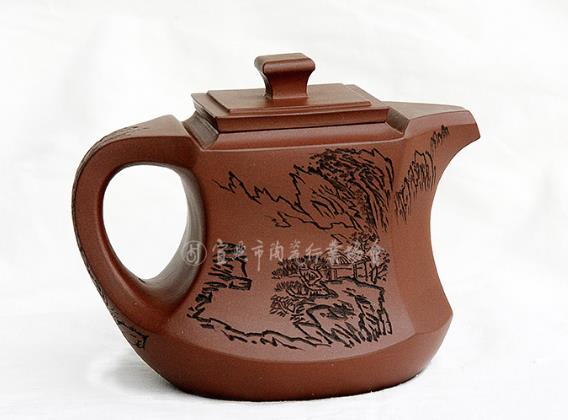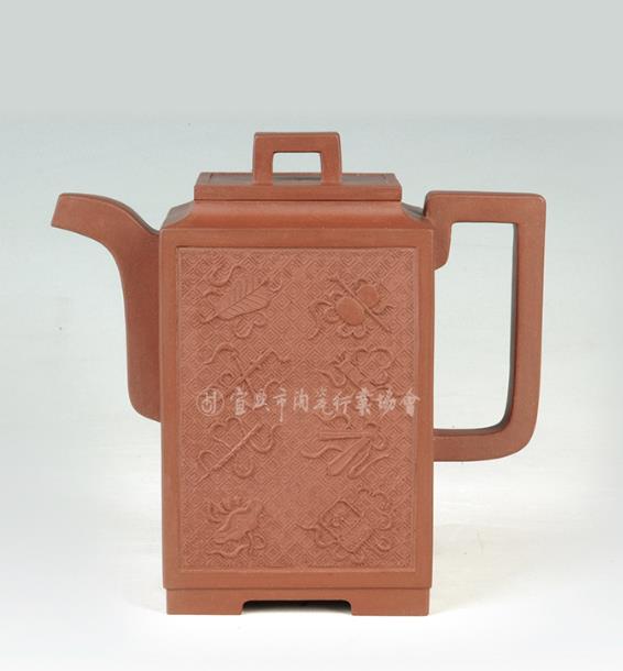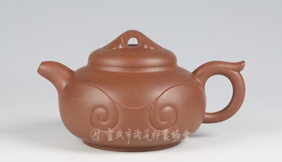 Thân ấm trên dưới phân tầng rõ rệt, trên thân ấm chia bố cục bốn hình họa văn “như ý” cuộn lại. Chân viền dạng vòng (圈足) khiến thân ấm tăng thêm phong vị端庄雅致 (đoan trang tao nhã). Vòi cong, quai vòng, phía trên quai bố trí “phi nhĩ” (tai vểnh), trên nắp ấm đặt núm cầu dạng như ý. Khí tức văn hóa truyền thống浓厚 (đậm đặc), thiết kế sáng tạo với ý tưởng mới lạ, khí vận sinh động, vừa có giá trị sử dụng, vừa có giá trị thưởng lãm nghệ thuật.