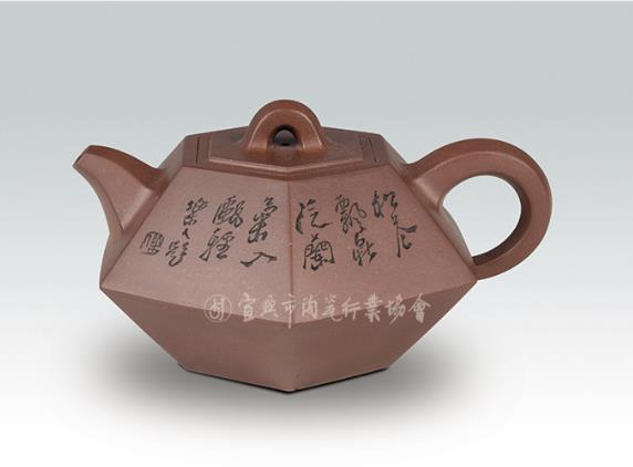 Tạo hình端庄平和 (đoan chính, hài hòa), trên dưới đều là sáu mặt khối cân xứng chỉnh tề; nắp ấm là nắp lục phương lắp chìm, các mặt thân ấm tròn đầy, dày dặn, thể hiện rõ công lực. Tác phẩm đưa hàm nghĩa văn hóa của “đấu” – dụng cụ đo lường phổ biến trong cổ đại Trung Hoa, tượng trưng cho “công bằng, công chính” – dung nhập vào nghệ thuật ấm tử sa.