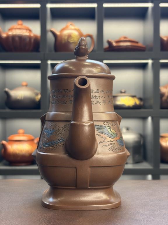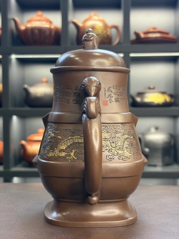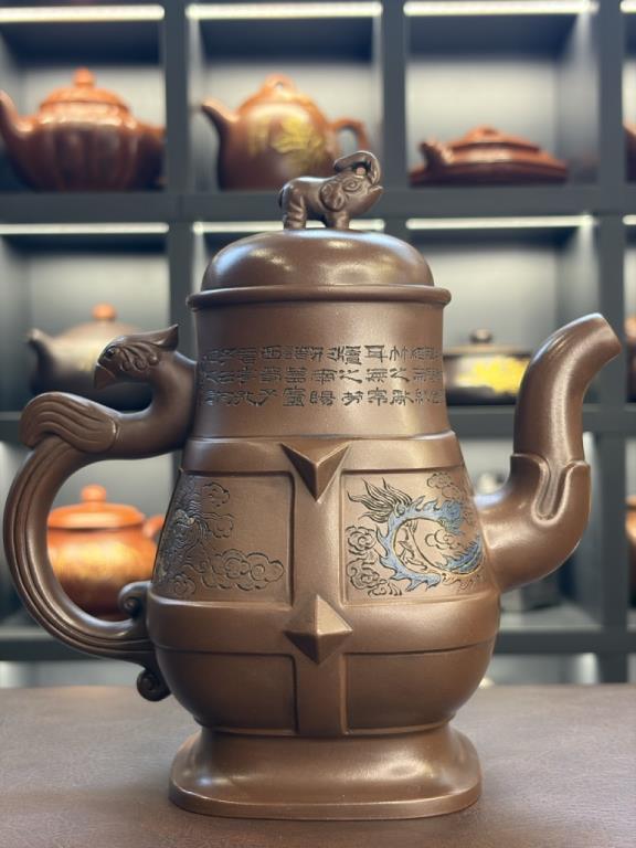 • Toàn bộ ấm mô phỏng theo rượu hồ cung đình thời cổ, phối cùng họa tiết khắc rồng – phượng 呈祥 (cát tường, điềm lành).