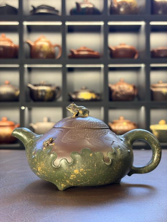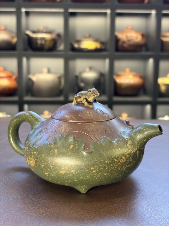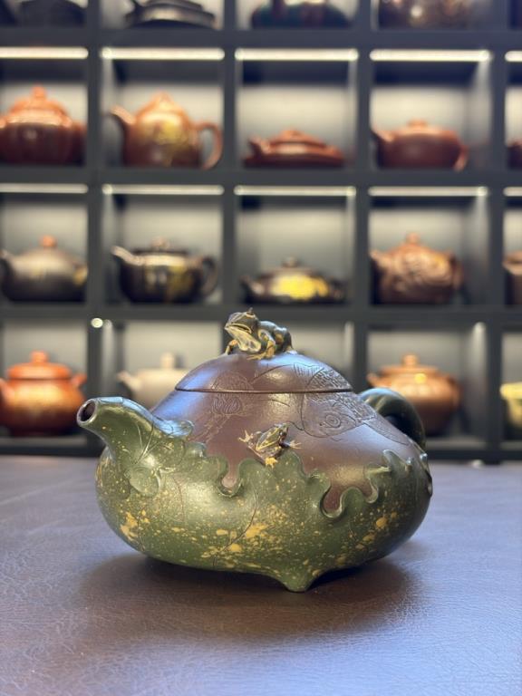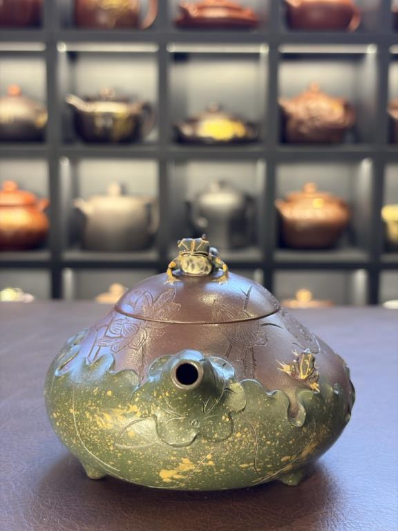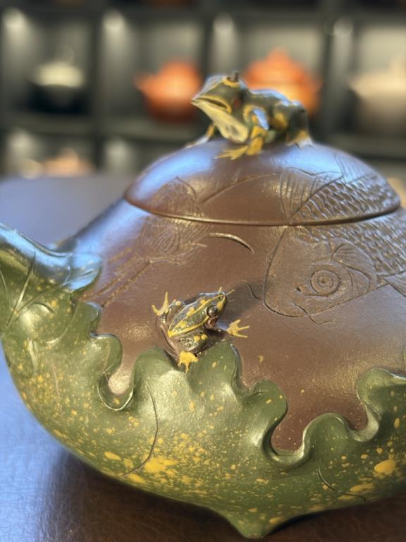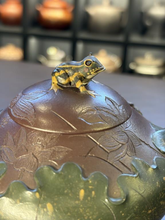 • Trên nắp ấm là hình chú ếch nhỏ sinh động, do chính Tưởng Dung (蒋蓉) – bậc thầy tạo hình động vật trong tử sa – giúp nặn tay và hoàn thiện.