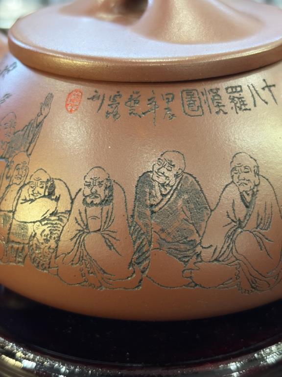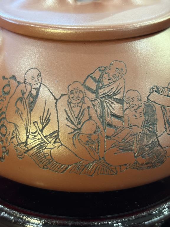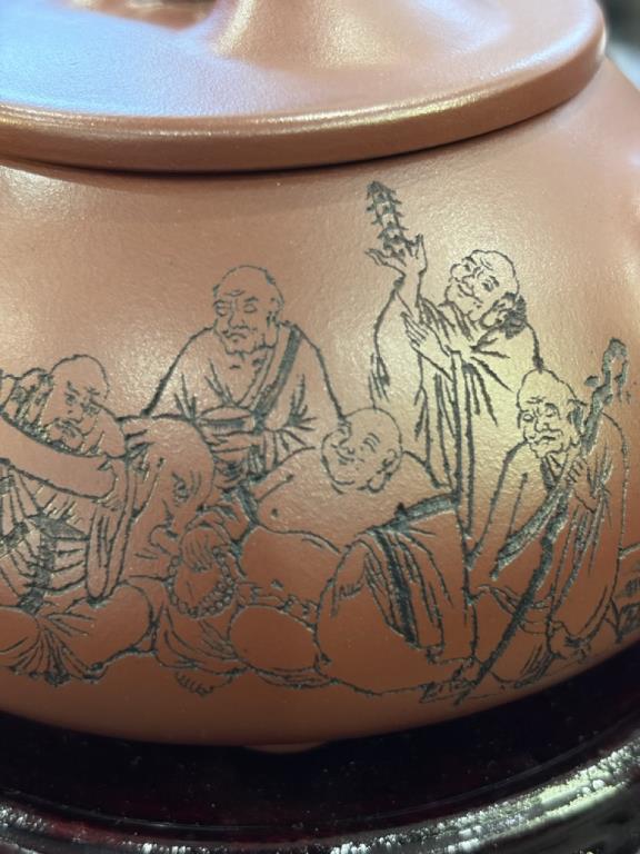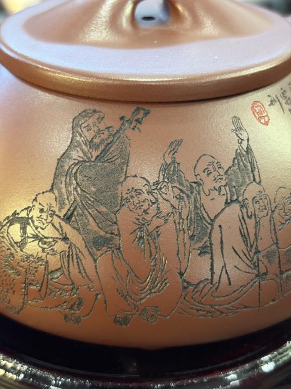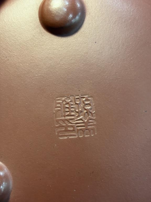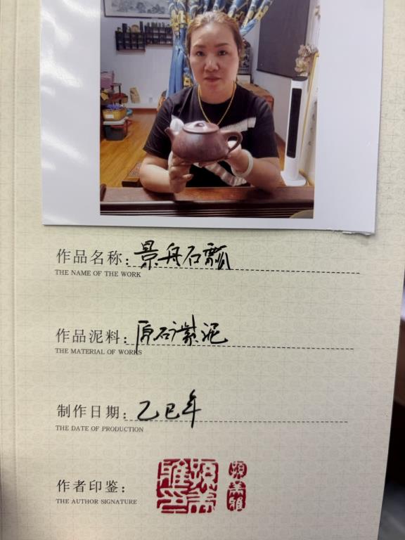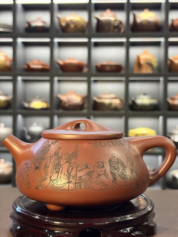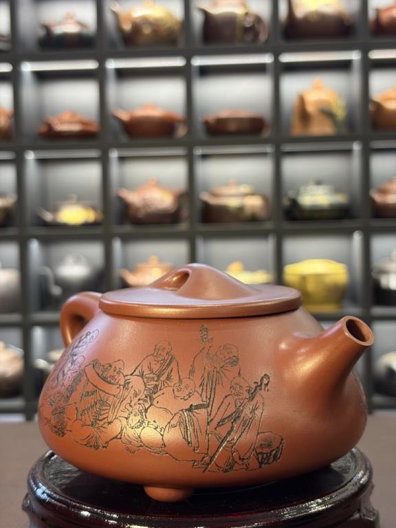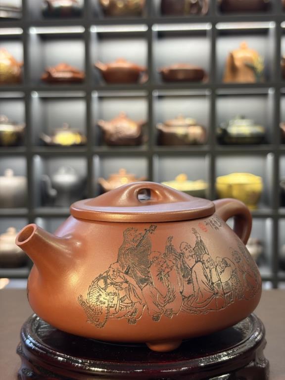Chiếc ấm Thạch Phiêu (石瓢) do nghệ nhân Tôn Mỹ Nhã toàn thủ chế tác, sử dụng Long huyết sa (龙血砂) – một dòng đất phối giàu khoáng chất, sắc đỏ sậm như máu rồng, hạt khoáng nổi rõ, bề mặt lên nước đẹp sau khi dưỡng lâu.