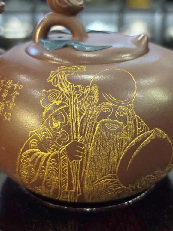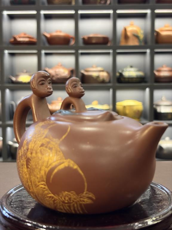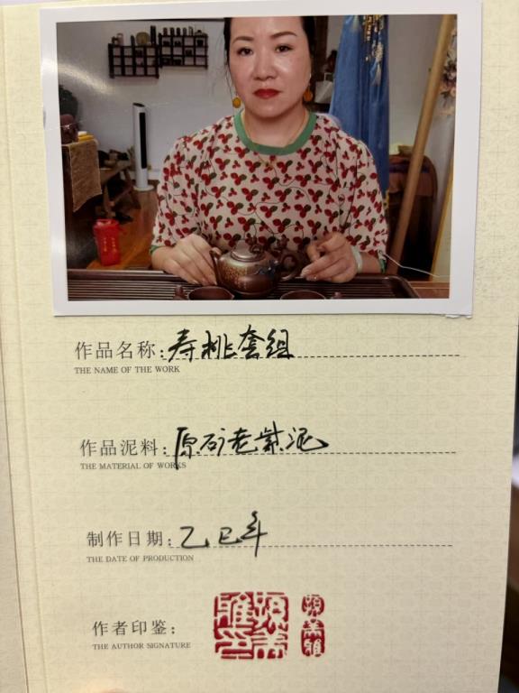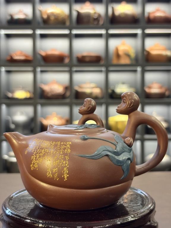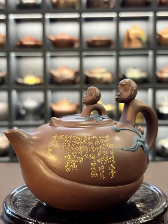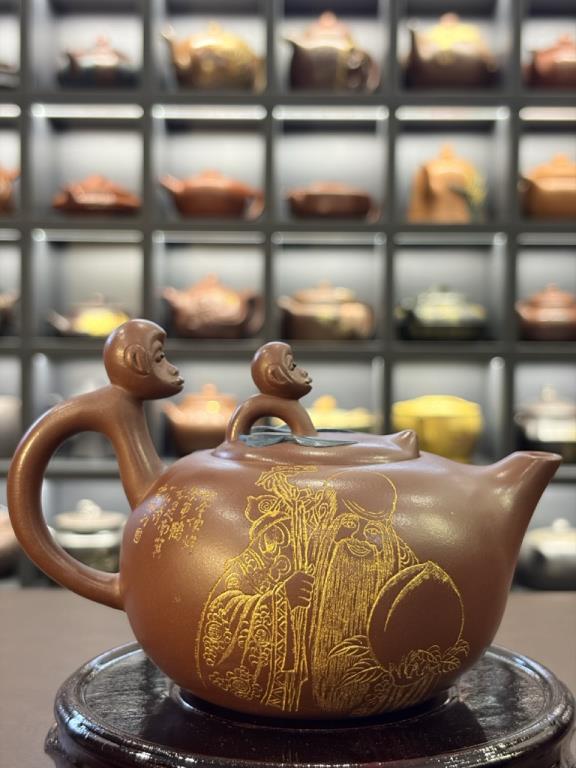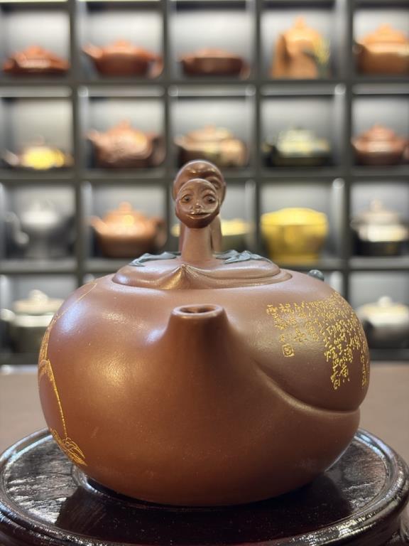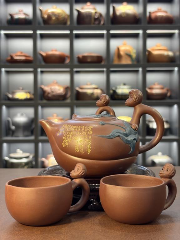 Tác phẩm này là một bộ ấm tử sa được nghệ nhân Tôn Mỹ Nhã thủ công hoàn toàn từ chất đất Đáy tào thanh nguyên khoáng (底槽清) – một dòng tử sa nổi tiếng với màu nâu tím trầm ấm, kết cấu ổn định, thẩm thấu tốt, giúp giữ trọn hương vị trà.