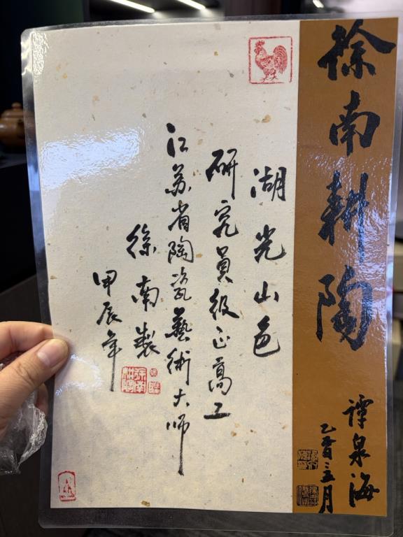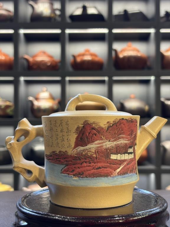 Tác phẩm “Hồ Quang Sơn Sắc” là một bộ ấm tinh xảo, được chế tác hoàn toàn thủ công bởi nghệ nhân Từ Nam – bậc thầy gốm nghệ của tỉnh Giang Tô, trên nền đất Bản sơn đoạn – một trong những loại đất quý có sắc vàng nhạt tự nhiên và kết cấu mịn, tôn vinh vẻ đẹp thuần hậu và trầm mặc.