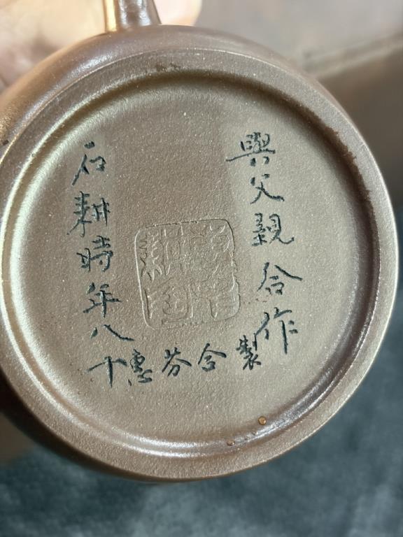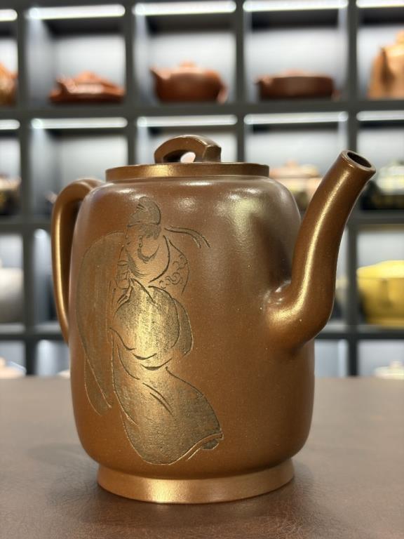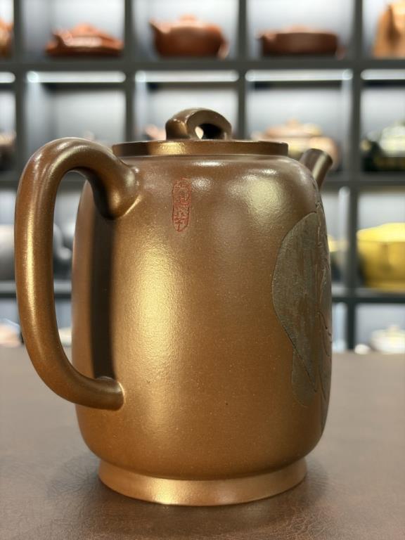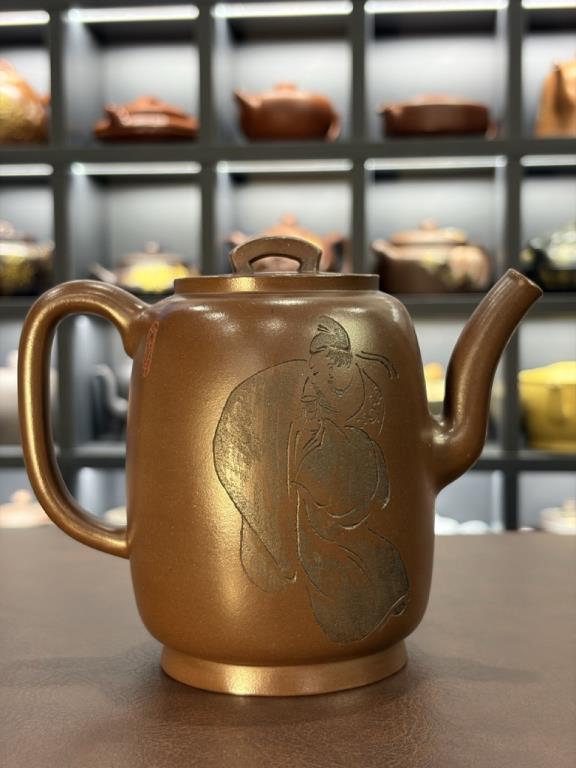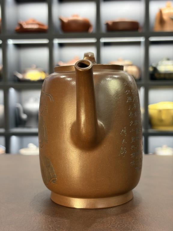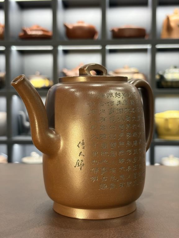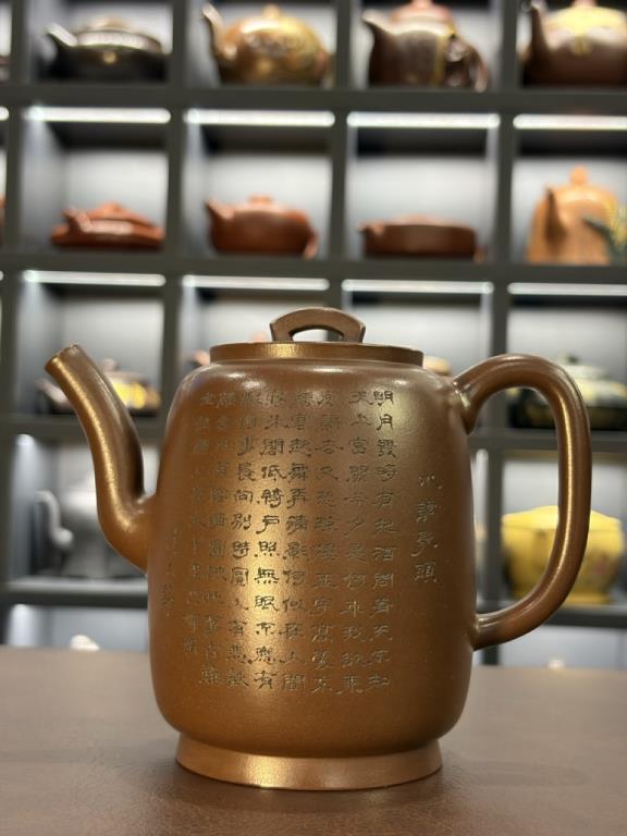 Ấm dùng Lão Tử Nê đặc cấp (特级老紫泥) chế tác; sắc đất còn ánh lên một quầng sáng mộc nhã rất tự nhiên, tựa như một chiếc cung đăng rực rỡ tỏa ra ánh sáng ấm áp. Thưởng ấm này, cái vận vị trôi chảy mỹ diệu thấm vào lòng; dáng vẻ hoa lệ lại càng khó quên. Trên ấm, cha ông là Vương Thạch Canh khắc vẽ ‘Thủy điệu ca đầu’ (水调歌头); cha con hợp tác, thật hiếm có!”