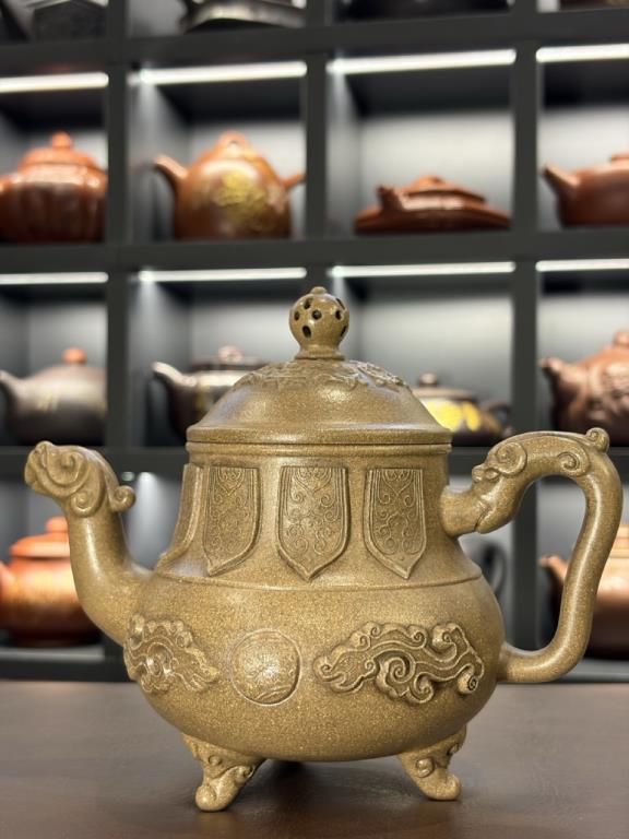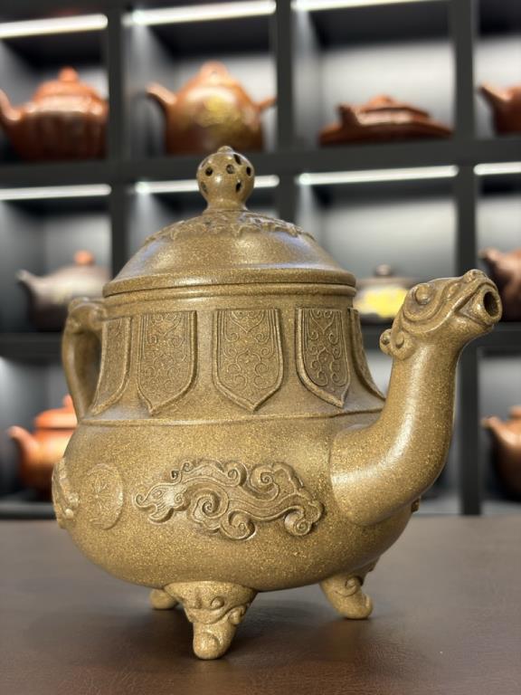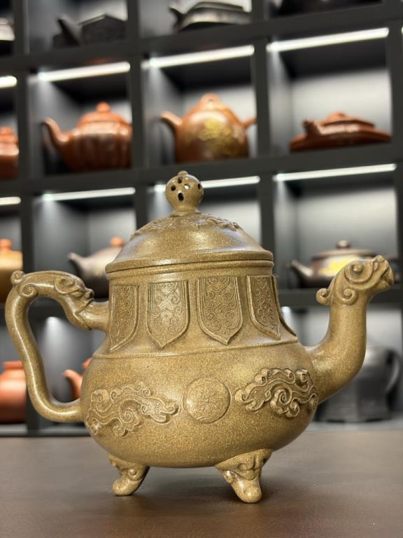 Khí vận tự nhiên, khác thường; ba chân (三足) cân chỉnh, vững và ổn, khiến tổng thể càng thêm đoan trang, rộng rãi, đúng mực. Phần vai có đường chỉ vòng trang trí, kèm mảng ‘vân kiên’ (云肩) dán lá; nắp ép (压盖) mộc nhã. Núm nắp dạng viên châu tròn thiết kế tinh xảo, cổ phác mà tuyệt đẹp.