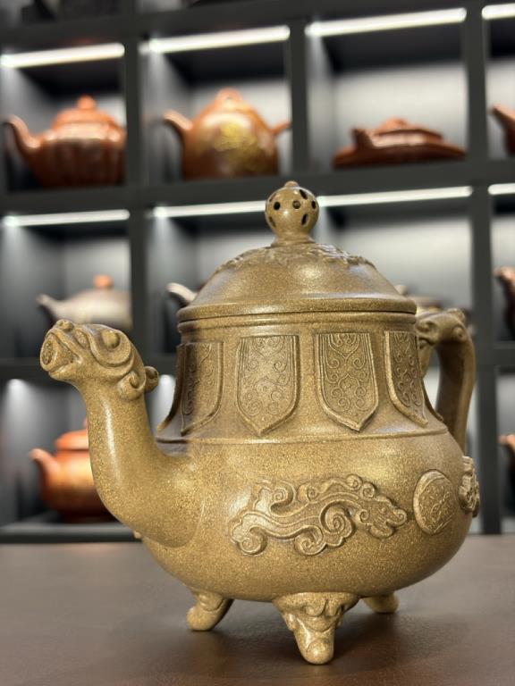 “Chiếc ấm này do thầy Chu Duy Bình (朱维平) chế tác, phần nặn tạo (捏塑) do ông nội của thầy—Chu Khả Tâm (朱可心), một trong ‘Tử Sa Thất Lão’ (紫砂七老)—thực hiện. Ấm mang vẻ tao nhã, cao quý, ý nghĩa cát tường, là lựa chọn hàng đầu để sưu tầm.
