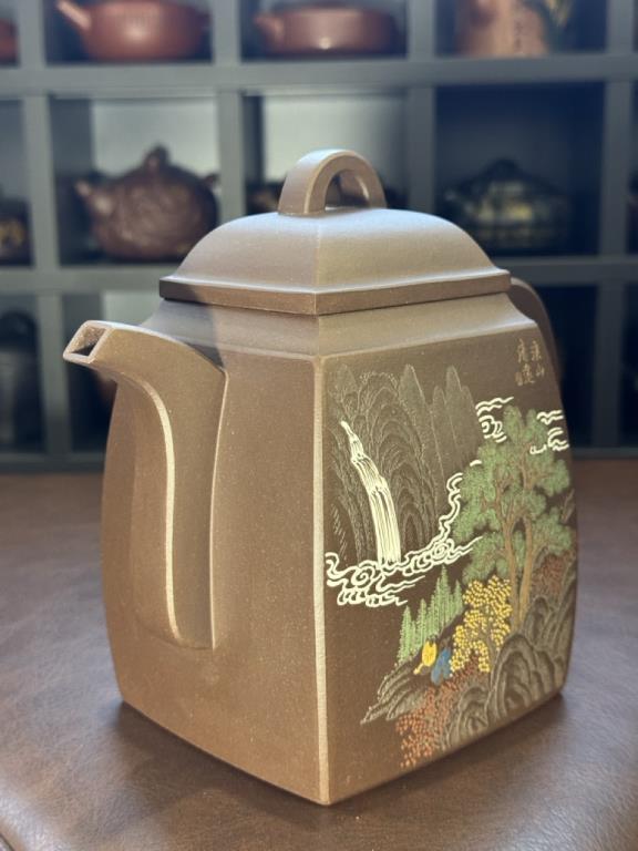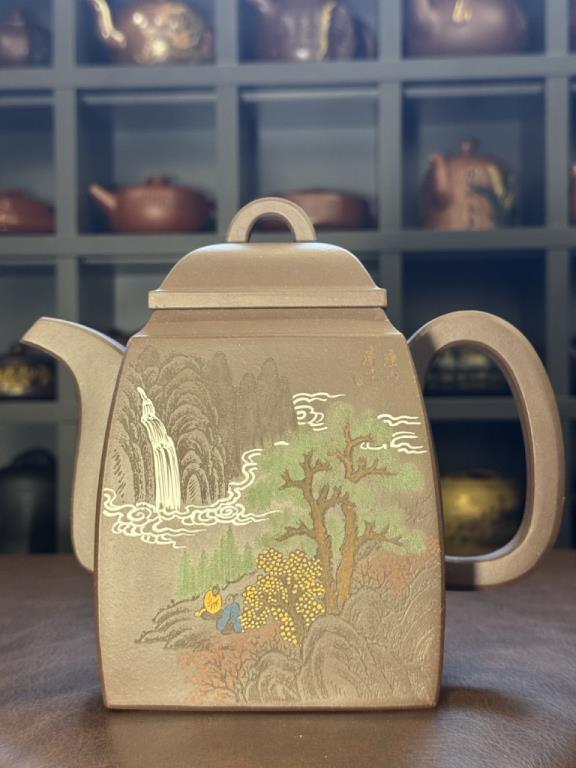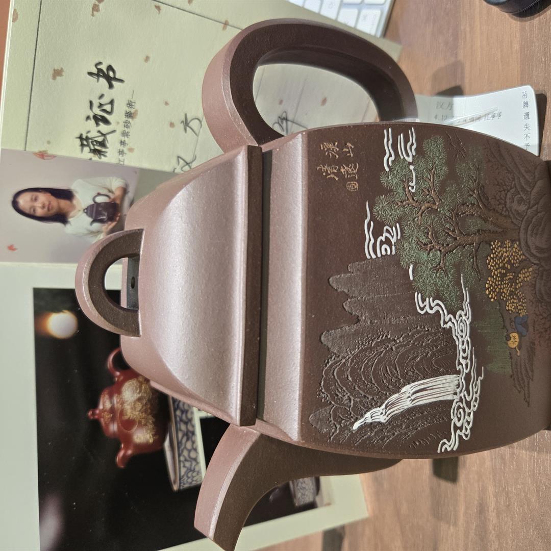 Ấm được chế tác hoàn toàn thủ công bởi nghệ nhân Giang Đình Đình, nổi bật với bề mặt trang trí tranh vẽ tay của thầy 艾越魏 (Ái Việt Ngụy) – người sáng lập hiệu 艾陶 (Ái Đào), nổi tiếng với kỹ thuật mỹ thuật tử sa + tranh thủy mặc truyền thống.