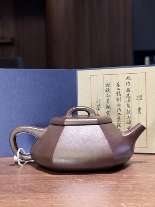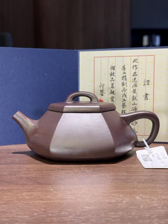 Chiếc ấm Lục Phương Thạch Tiêu là một biến thể cao cấp của dáng Thạch Tiêu (石瓢) – một trong những dáng ấm kinh điển nhất trong nghệ thuật tử sa. So với bản gốc có thân hình tam giác mềm mại, Lục Phương Thạch Tiêu được cải biến với sáu mặt cạnh rõ nét, tạo nên hình khối chắc chắn, góc cạnh dứt khoát và cảm giác cổ kính, khí tiết.
