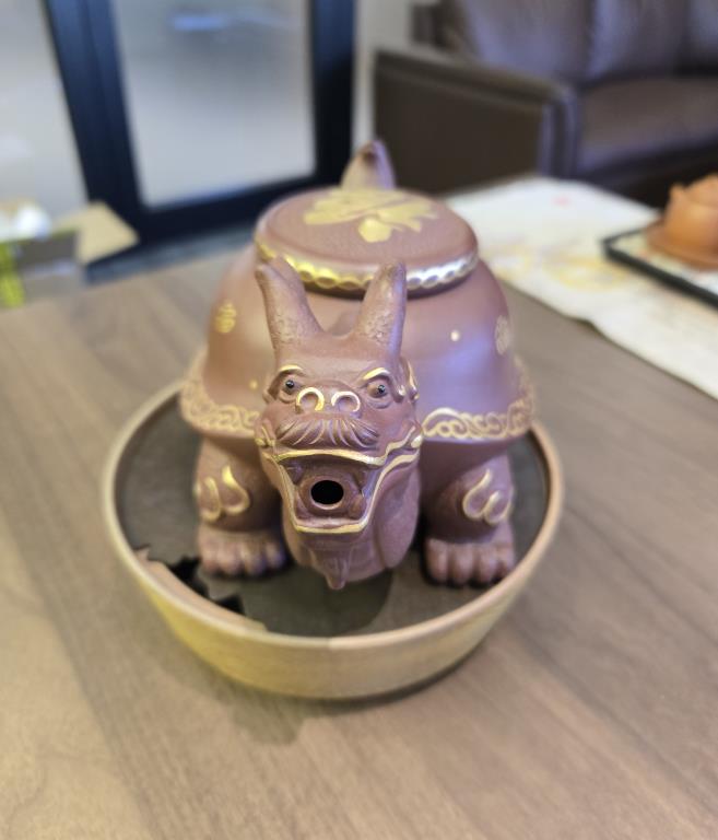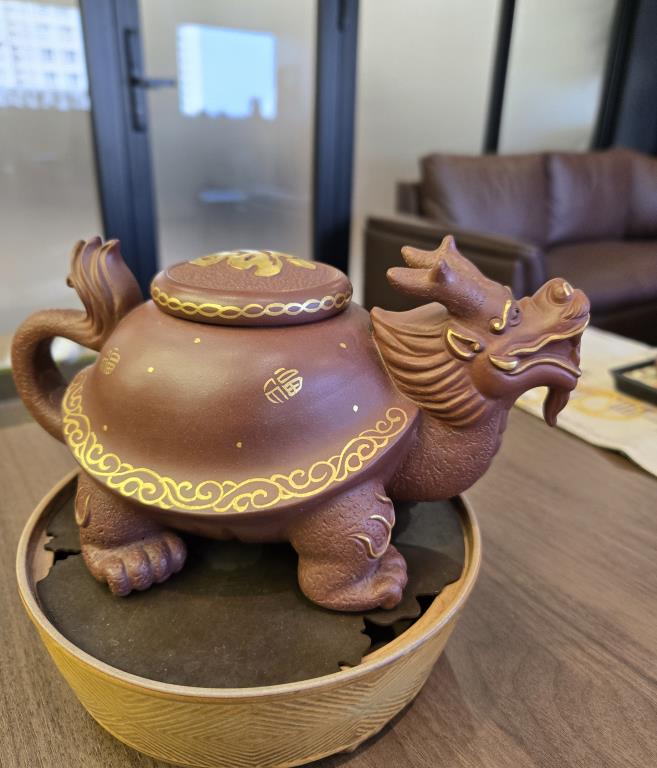 Long Quy (rồng rùa) trong văn hóa Á Đông là linh vật tượng trưng cho trường thọ, vững bền và phú quý. Tạo hình của ấm đậm chất điêu khắc, thân hình rồng rùa được thể hiện sinh động, uy nghi mà không mất đi nét hiền hòa, mang đến cảm giác cát tường và trang trọng.