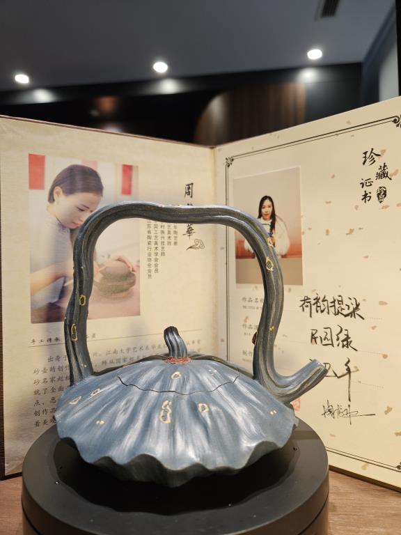 Tác phẩm mang hình dáng đề lương (đòn gánh) truyền thống, kết hợp cùng họa tiết liên hoa (hoa sen), tượng trưng cho sự thuần khiết, điềm tĩnh và thanh cao. Dáng ấm cân đối, tay cầm gọn, giúp việc rót trà nhẹ nhàng và ổn định. Dung tích 180ml, vừa vặn cho các buổi trà đạo tĩnh lặng cá nhân hoặc dùng với một người tri kỷ.