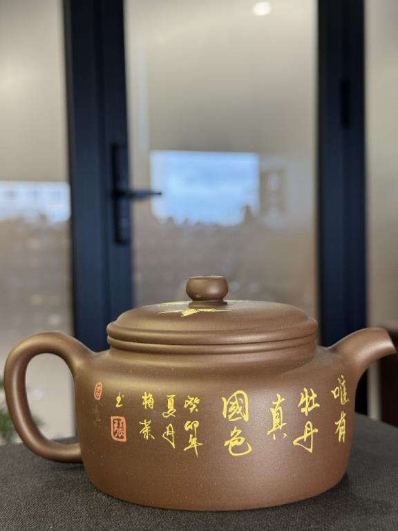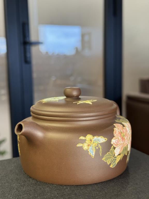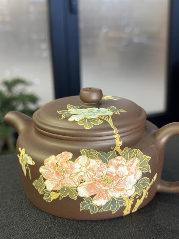 Ấm được chế tác từ lão tử nê (老紫泥) – một loại tử sa già đã qua thời gian tồn trữ, có đặc tính chín sâu, cấu trúc chặt, độ thấm khí vừa phải. Lớp ngoài được trang trí thái họa miêu kim (彩绘描金) – kỹ pháp truyền thống mang tính cung đình, với nét vẽ mềm mại phối cùng họa tiết dát vàng, làm nổi bật sự trang nhã, quý khí của tác phẩm.