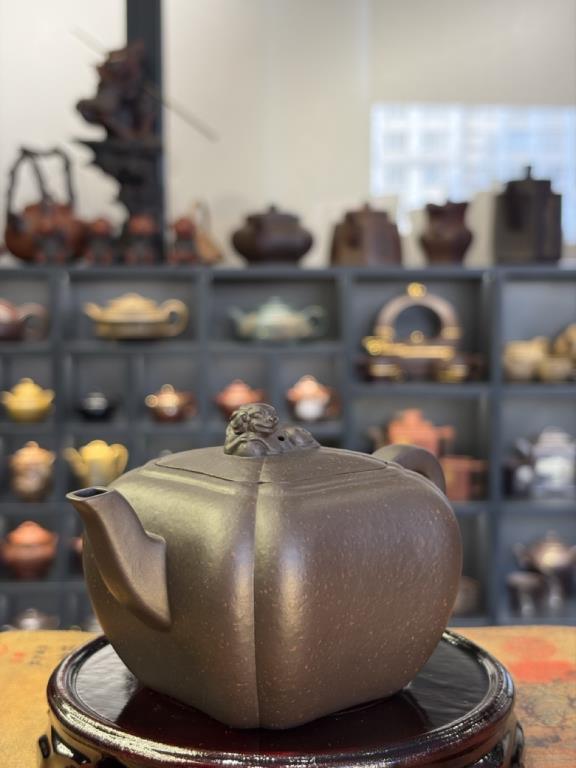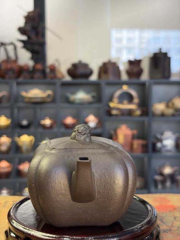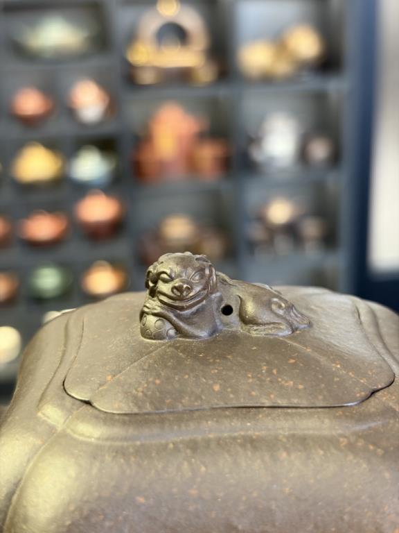 Dáng ấm có phần thân tròn đầy, vững chắc, thường có núm nắp tạo hình sư tử nhỏ hoặc cầu khắc nổi, tay cầm và vòi uốn cong uyển chuyển, tổng thể mang khí thế mạnh mẽ nhưng vẫn có tính nghệ thuật cao. Đây là mẫu ấm được nhiều người yêu thích không chỉ vì công năng, mà còn do giá trị trưng bày và phong thủy rõ rệt.