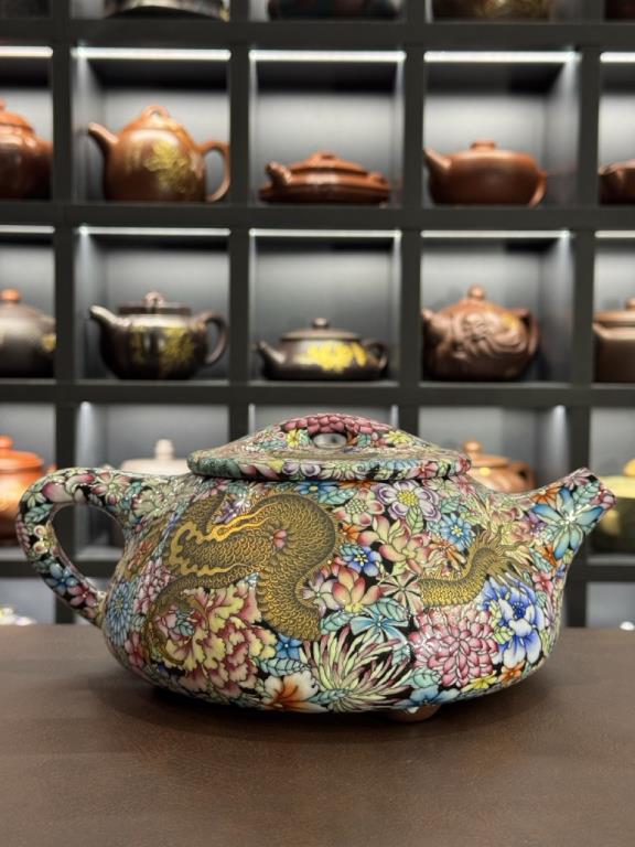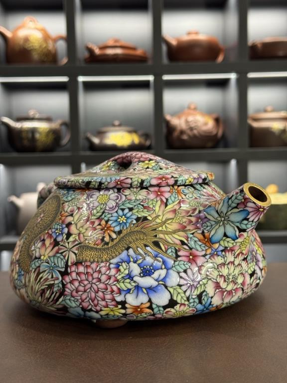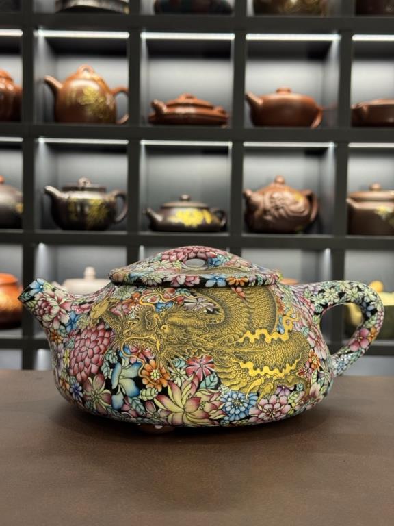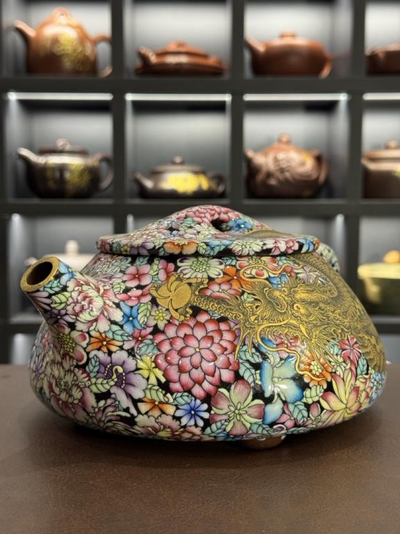🌈 Điểm nhấn nổi bật là toàn bộ ấm được trang trí bằng kỹ thuật珐琅彩 (Pháp Lang Thái) – một kỹ thuật men màu độc đáo có nguồn gốc từ hoàng cung.