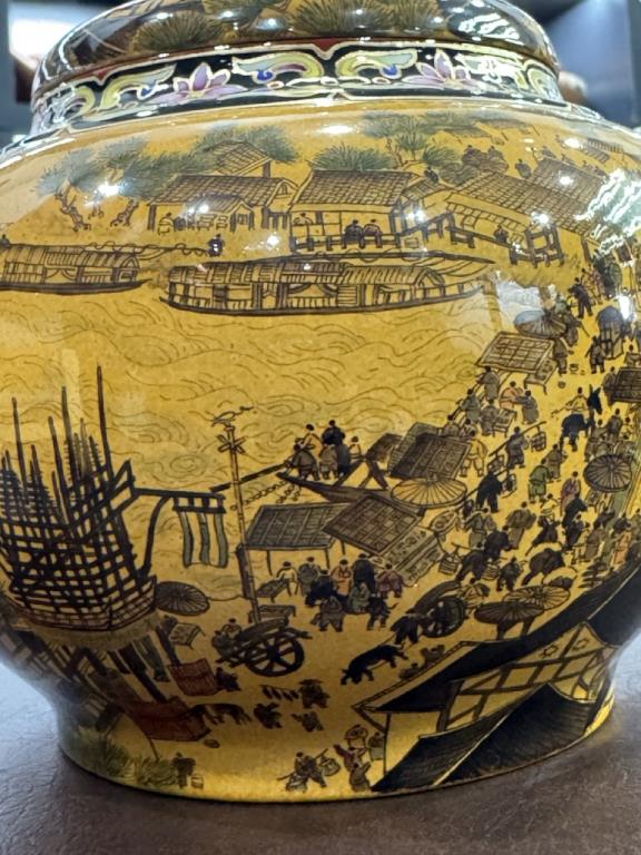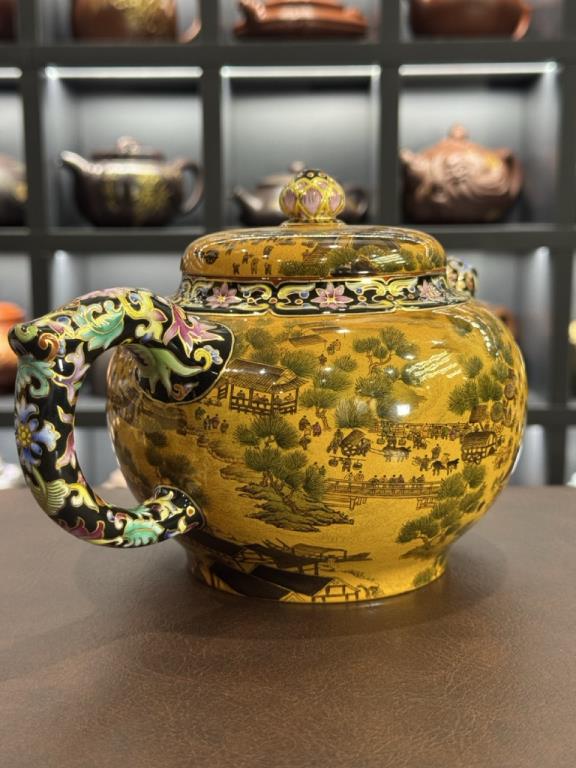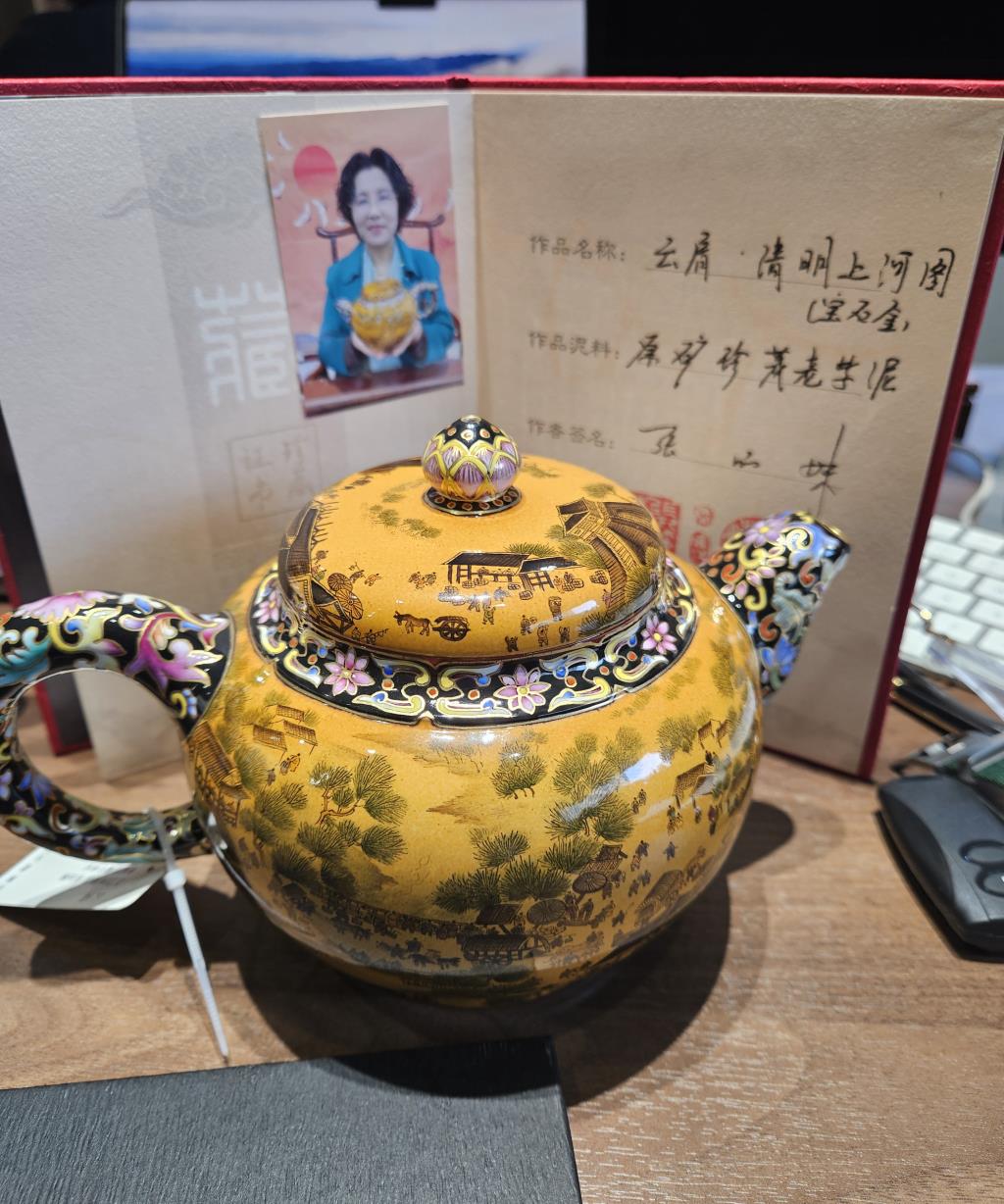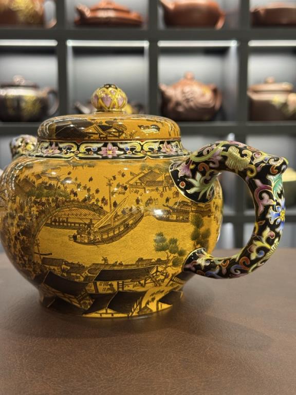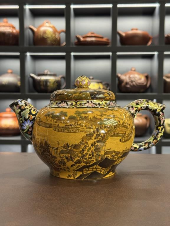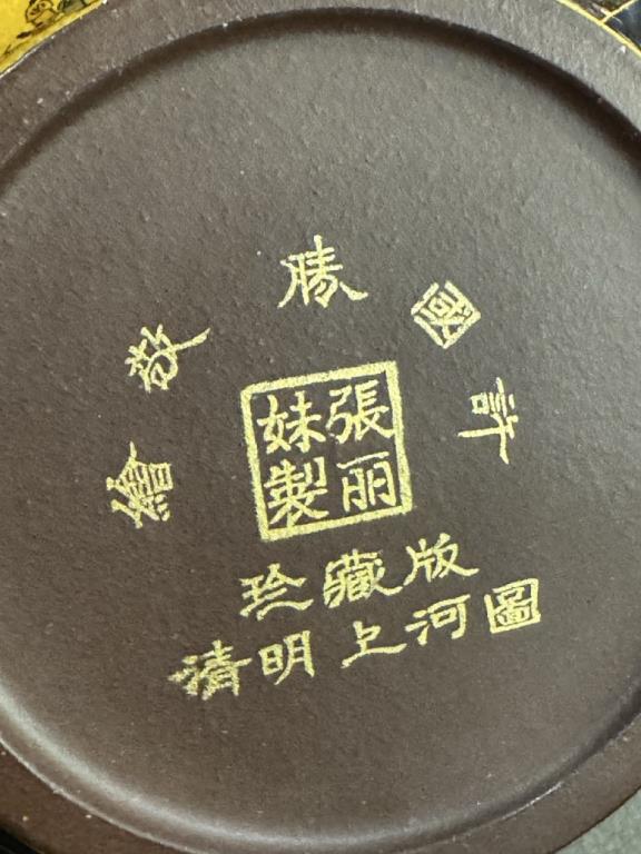 🖌 Trên thân ấm là hình ảnh “Thanh Minh Thượng Hà Đồ (清明上河图)” – bức tranh danh tác của họa sĩ Bắc Tống Trương Trạch Đoan (张择端), mô tả sự phồn vinh của kinh đô Biện Kinh (nay là Khai Phong, Hà Nam) vào thời Bắc Tống. Đây là một trong những kiệt tác nổi bật nhất trong lịch sử hội họa Trung Hoa.