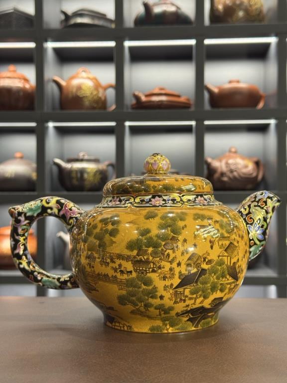 🎨 Điểm đặc biệt nhất của ấm là trang trí bằng珐琅彩 (Pháp Lang Thái) – một kỹ thuật men màu được sử dụng trong cung đình thời Thanh, kết hợp với vàng ròng và bảo thạch, tạo nên vẻ đẹp sang trọng, quyền quý, và có giá trị nghệ thuật cao.