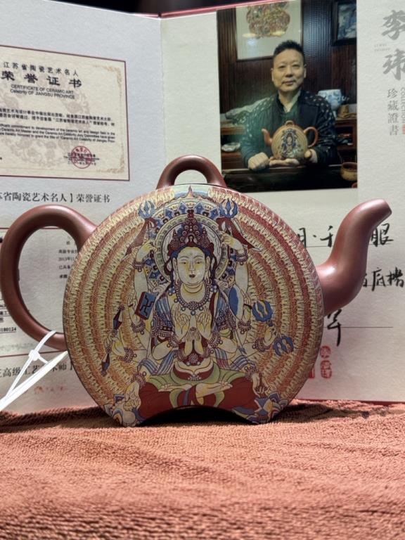 Trang trí trên thân ấm là hình ảnh Quan Âm Thiên Thủ Thiên Nhãn, trích từ bích họa động 18 tại quần thể hang Mạc Cao (敦煌莫高窟) – một trong những kho tàng mỹ thuật Phật giáo lớn nhất Trung Hoa.