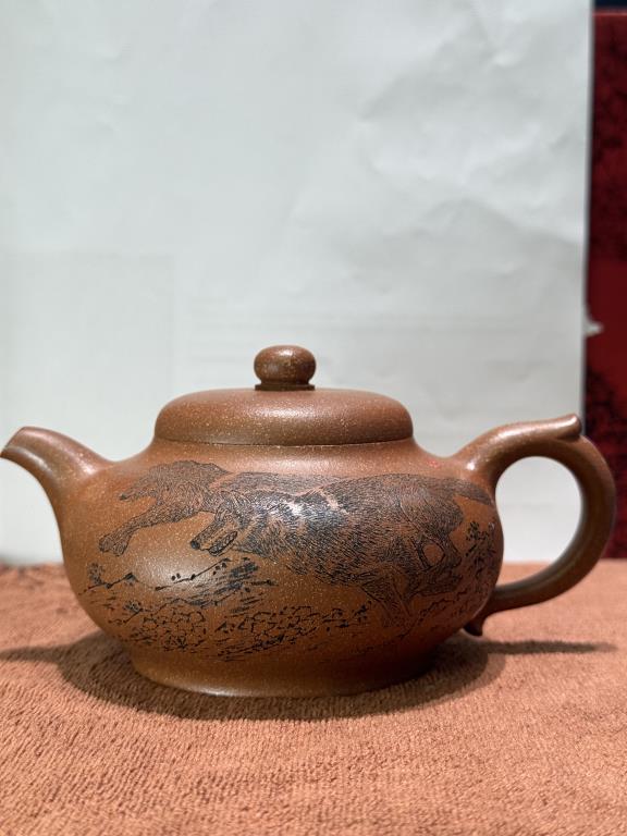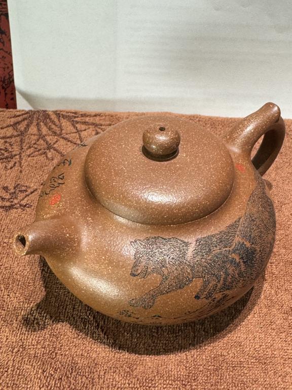Điểm nhấn đặc biệt là hình tượng con sói được chạm khắc sống động trên thân ấm. Sự kết hợp giữa dáng ấm và chủ đề điêu khắc truyền tải một thông điệp rõ ràng và dứt khoát: