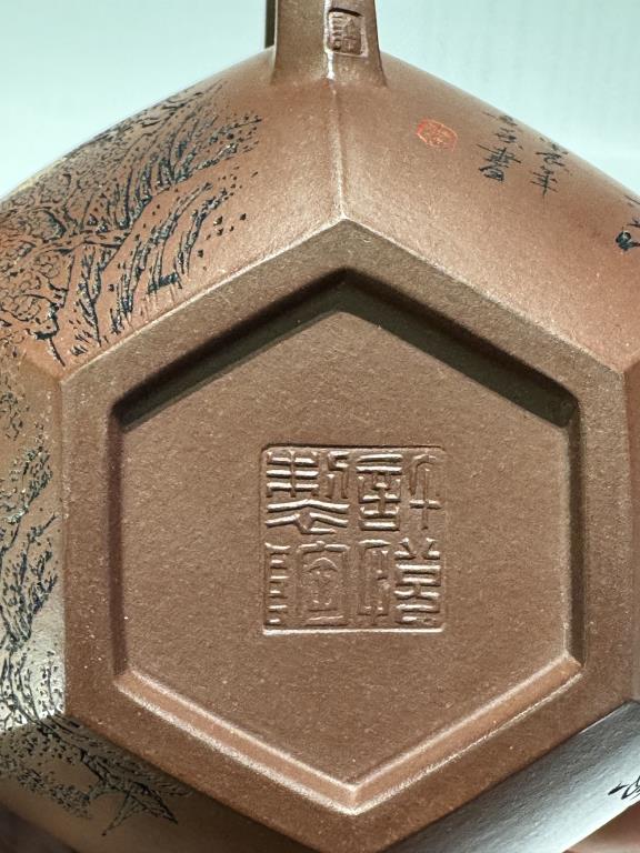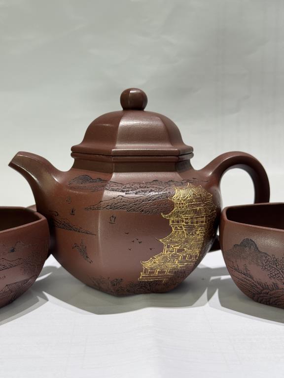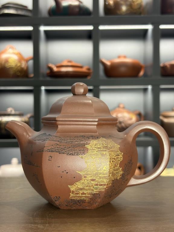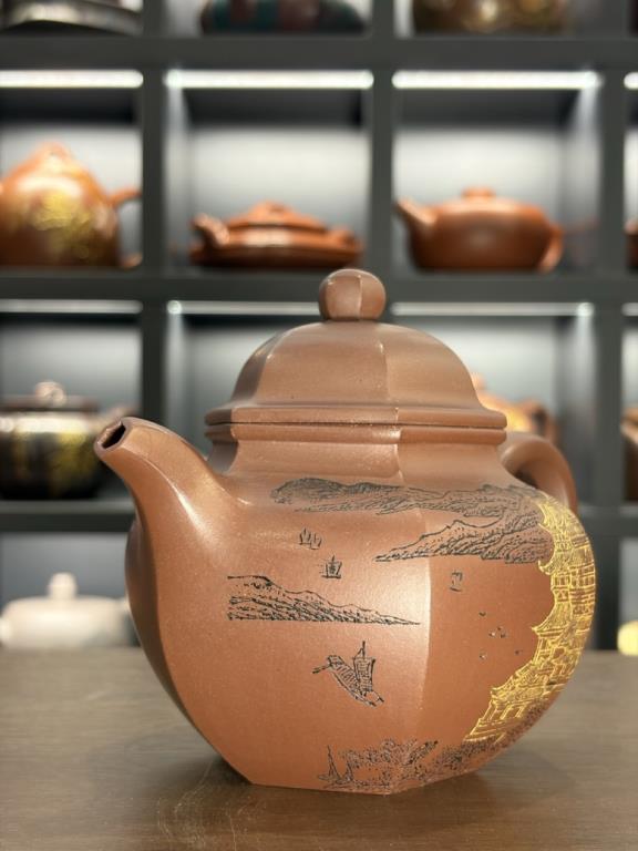 • Thân ấm có chạm khắc kèm vẽ kim (描金): tôn thêm phần quý khí, đồng thời làm nổi bật hình họa trên nền đất trầm