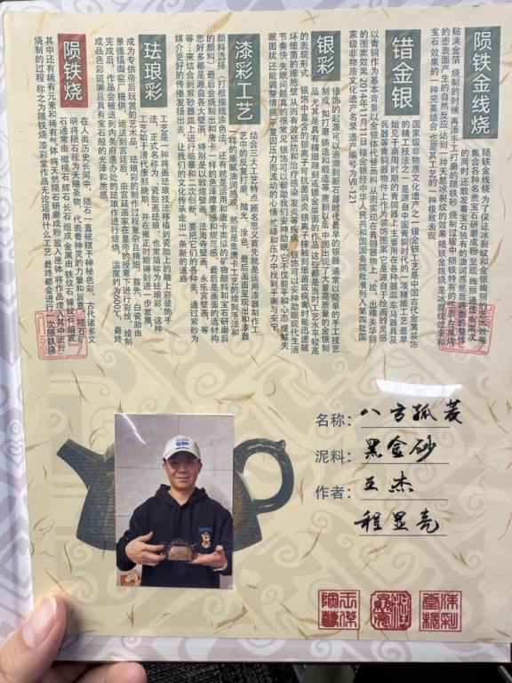 Phần trang trí ấm sử dụng kỹ pháp sơn mài màu thủ công (彩漆画技法) – một kỹ thuật kết hợp giữa sơn mài truyền thống và hội họa hiện đại. Giá trị của tác phẩm được nâng cao nhờ:
