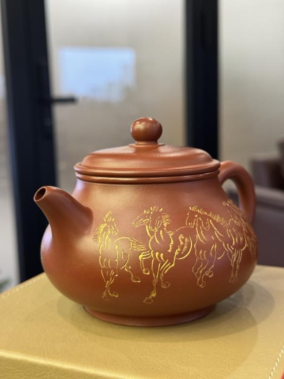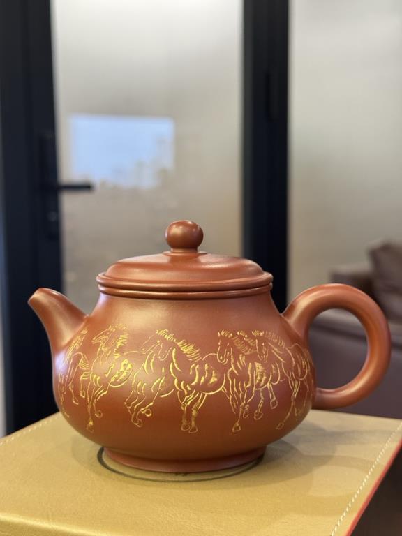 Khắc họa “Bát Tuấn Đồ” (八骏图) – danh tác nổi tiếng của danh họa Từ Bi Hồng (徐悲鸿) được chính Từ Lục Minh, truyền nhân trực hệ của họa sĩ, thực hiện lên thân ấm.
