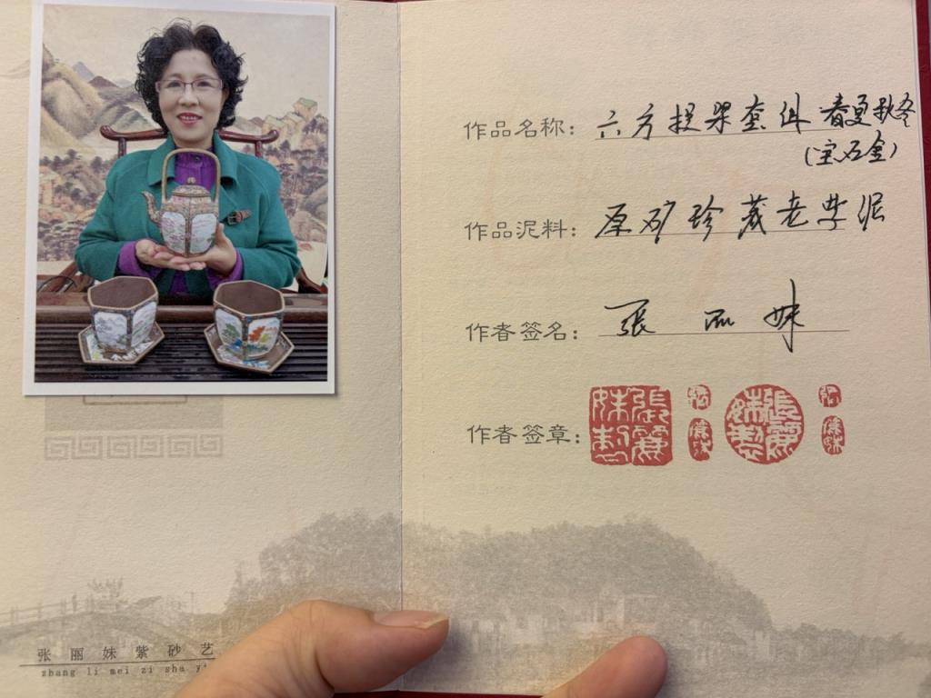 Tác phẩm Lục phương cung đăng có quai xách là bộ ấm được nghệ nhân Trương Lệ Muội (张丽妹) chế tác hoàn toàn thủ công, sử dụng chất đất lão tử nê quý hiếm từ kho đất gia truyền.