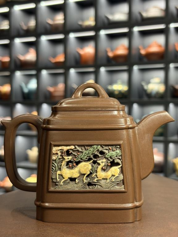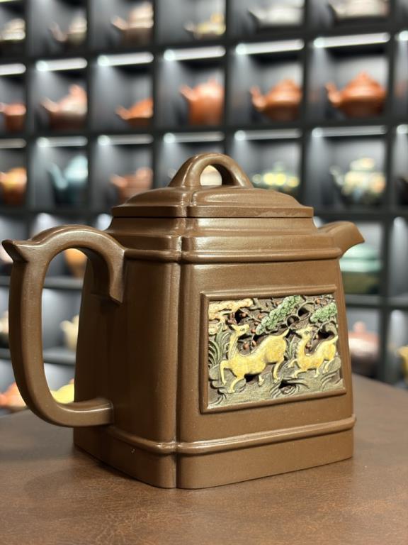Ấm “Tứ Phương Ẩn Giác Cung Đăng” là tác phẩm toàn thủ công của nghệ nhân Nhâm Hoa, phần khắc vẽ do cha ông là Nhâm Tiểu Tùng thực hiện.