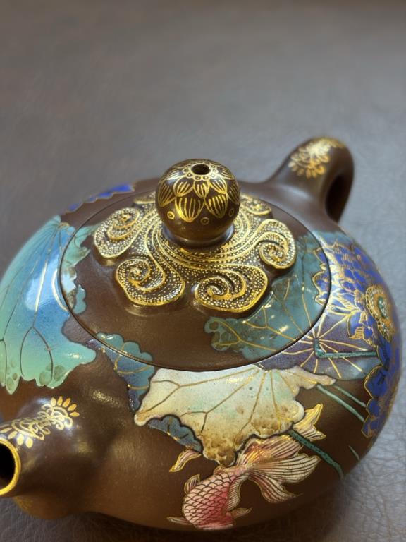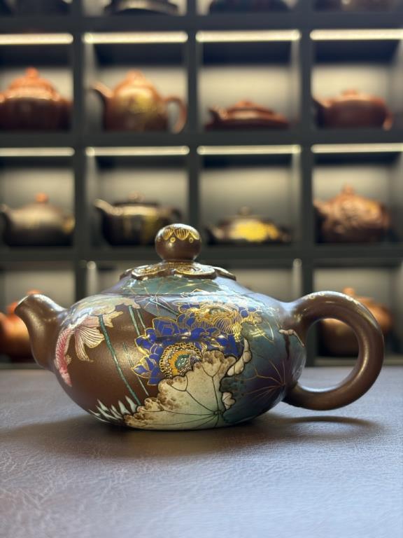 Thân ấm lấy tử sa nguyên khoáng làm nền, chất đất mộc mạc, ấm áp. Trên đó, hoa văn ngọc như ý được vẽ bằng pháp lang thái với những đường nét mềm mại như mây trôi, viền vàng tô điểm thêm phần trang trọng.