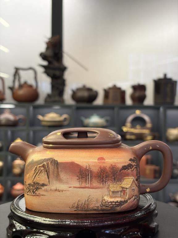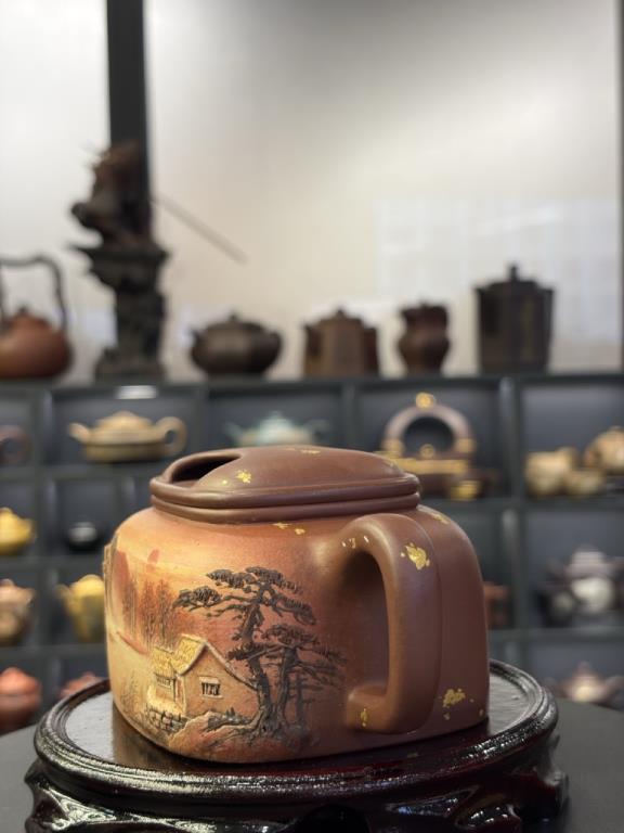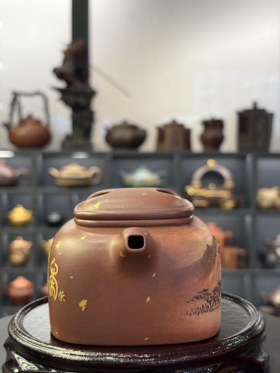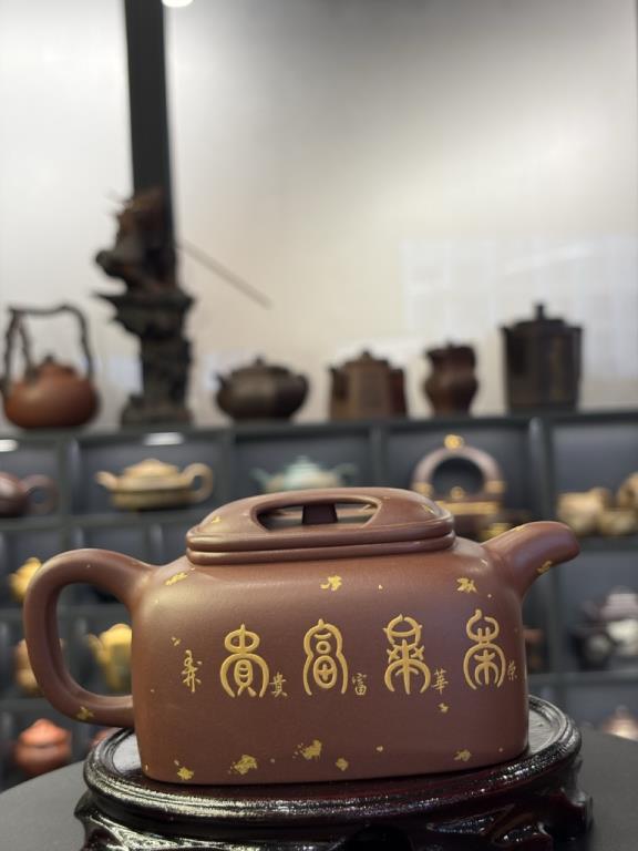 Về trang trí, thân ấm được mô tả sử dụng vàng ròng 24K, vàng nguyên chất được nghiền thành kim phấn (金粉), sau đó nung lần hai ở khoảng 800°C (800℃左右) để tạo hiệu ứng kim sắc bền màu, “cửu dụng di tân” (久用弥新). Khi đặt cạnh sắc tím trầm của tử sa, tổng thể cho cảm giác “tử–kim tương huy” (紫金相辉), giàu tính nghi lễ và trưng bày.