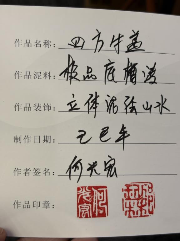 Ngưu Cái Tứ Phương Ấm là một tác phẩm phương khí mang khí chất trang trọng, vững chãi, được thực hiện trên nền cực phẩm Đế Tào Thanh nguyên khoáng với dung tích 300ml. Tác phẩm do nghệ nhân Hà Quang Hồng sáng tác, phần trang trí do Khâu Ngọc Lâm, Trung Quốc Gốm Sứ Nghệ Thuật Đại Sư, đảm nhiệm.
