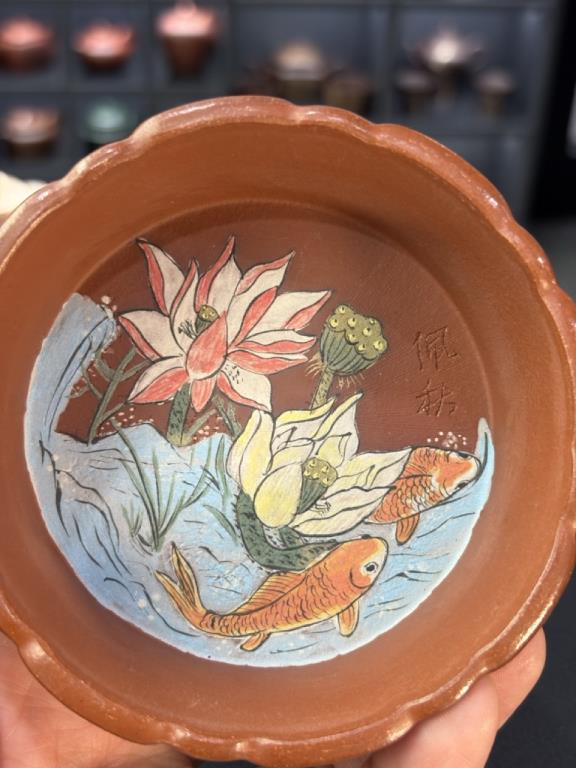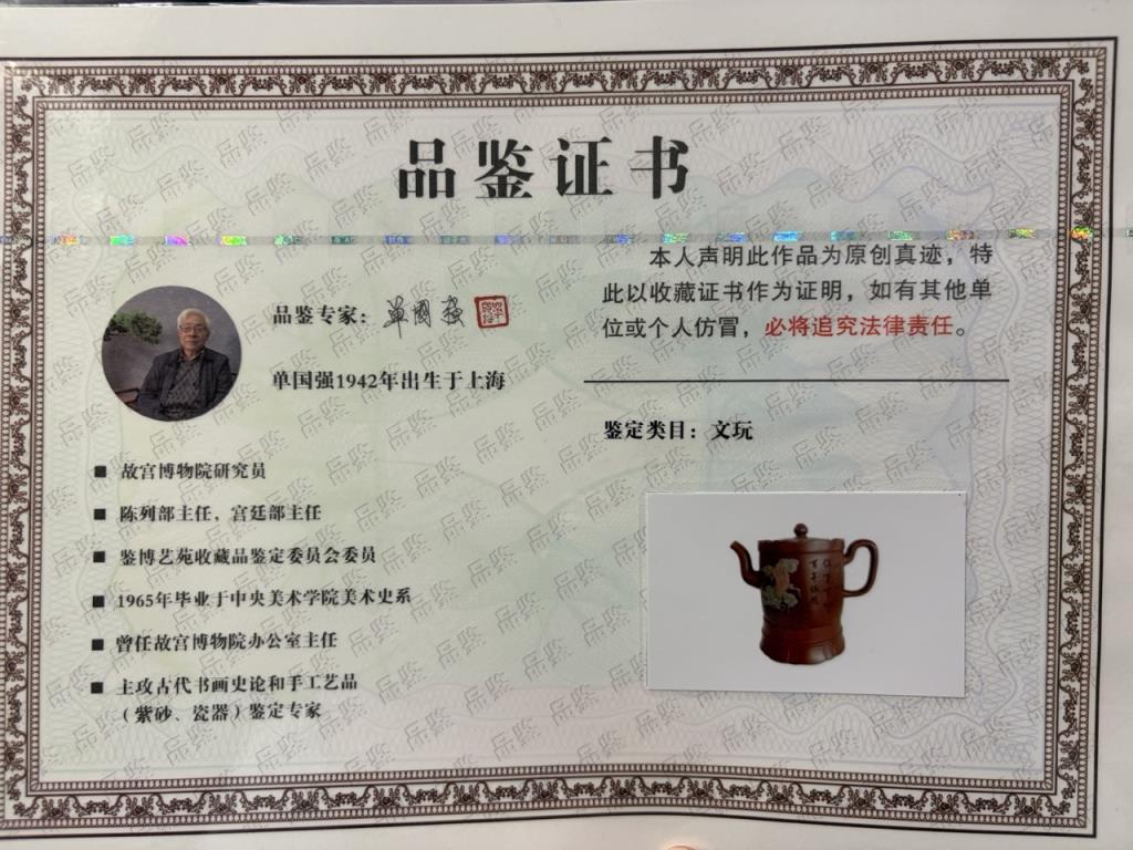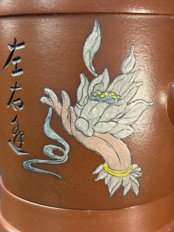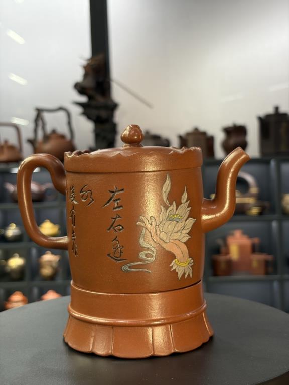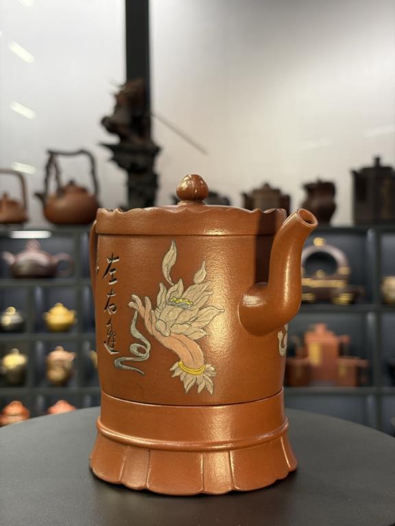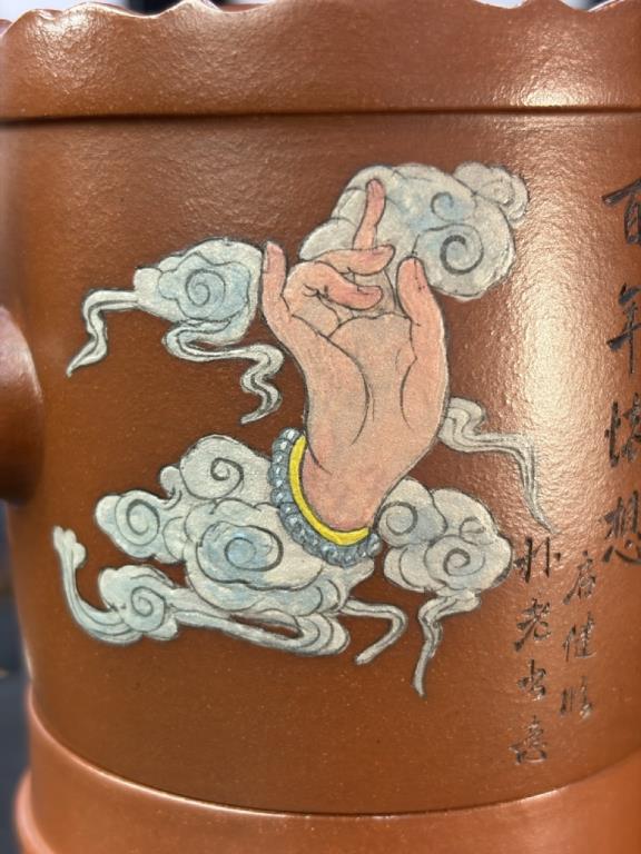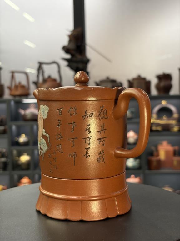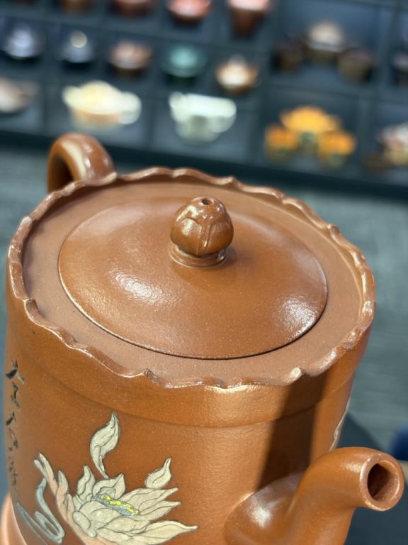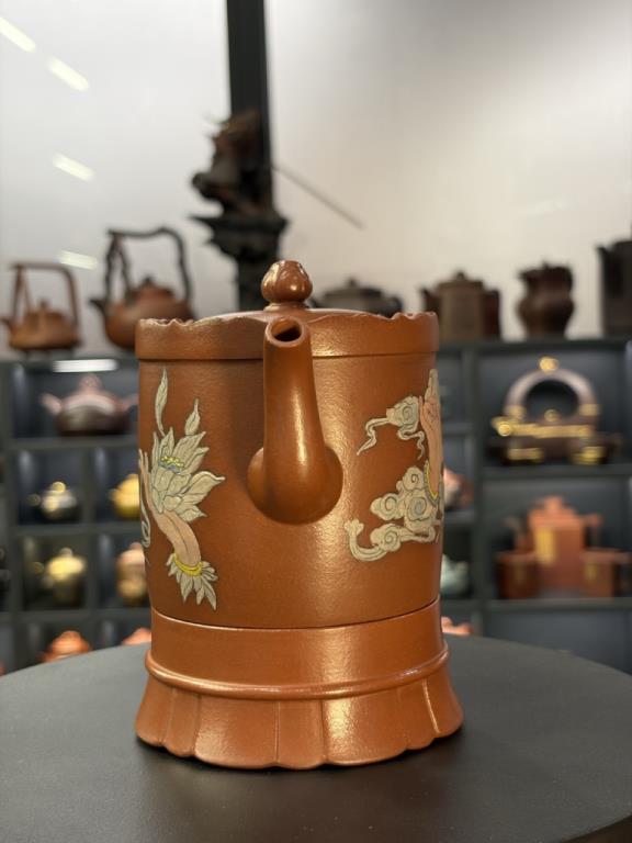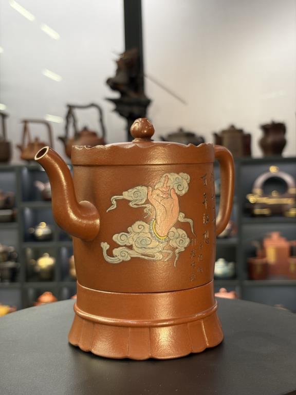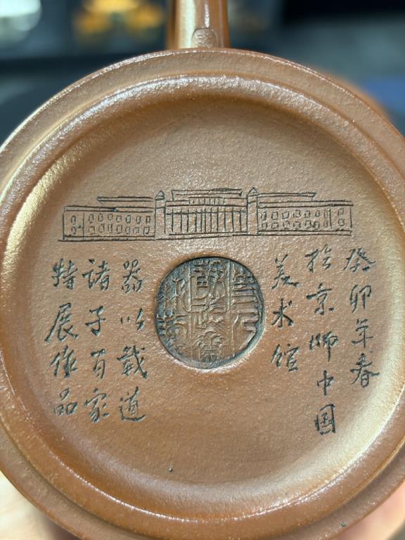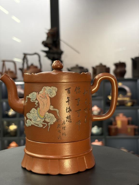 Tác phẩm được hoàn thiện bằng sự “xảo tư” và “tinh công”: tác giả nhào đất tạo vật đồng thời ký thác hoài vọng về một cảnh giới cao xa, nên ý tượng khá rõ ràng, dễ khiến người thưởng ấm dừng lại ở ý cảnh điển nhã mà chiếc ấm kiến tạo. Một chi tiết thực dụng đáng chú ý: tác giả còn gia thêm một đế kê có thể dùng như lót chén nhỏ, hoặc làm đế đặt nắp khi pha trà.