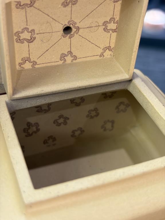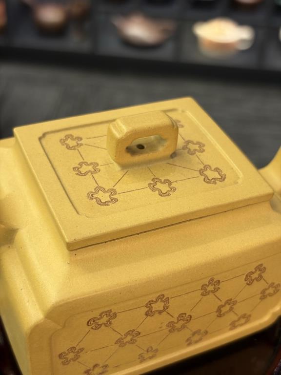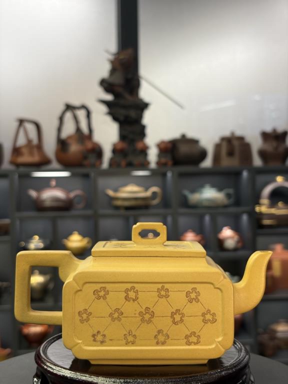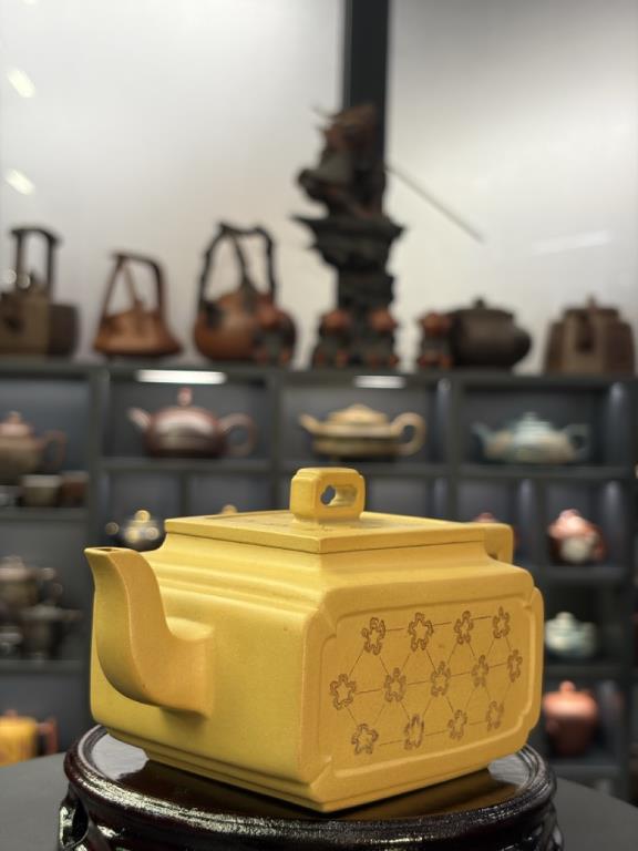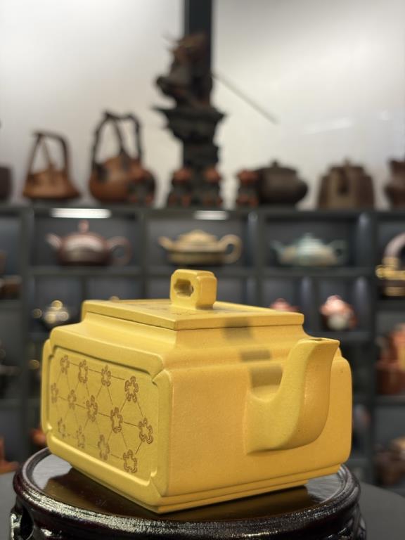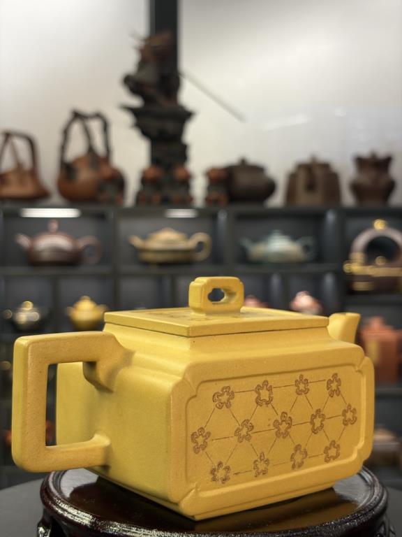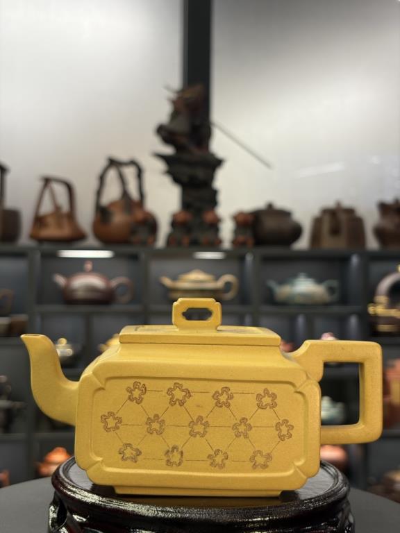 Hương Phiêu Tứ Phương Ấm là tác phẩm phương khí, thể hiện ý tứ “hương lan bốn hướng”, phù hợp tinh thần thưởng trà thanh nhã. Ấm được thực hiện bởi nghệ nhân Trang Hàm — tên thật Trang Lệ Trân, xuất thân từ gia đình tử sa Nghi Hưng. Tác phẩm dùng Hoàng Kim Bổn Lục, một hệ đất mang sắc thái thanh sáng, hợp với bố cục phương khí vừa có độ nghiêm cẩn vừa có độ tươi.