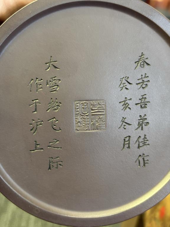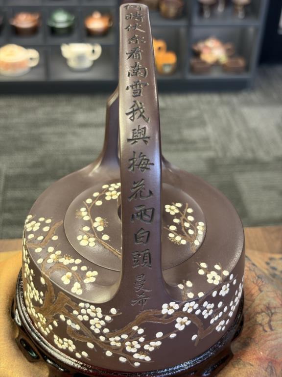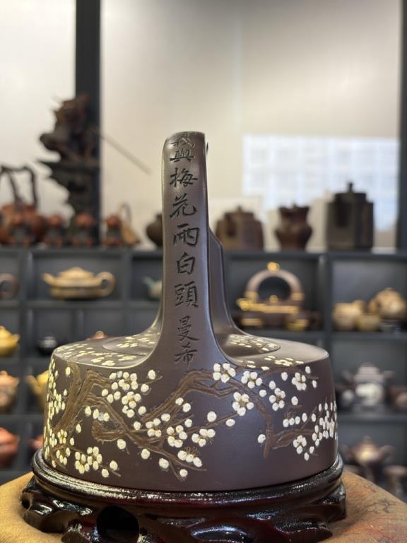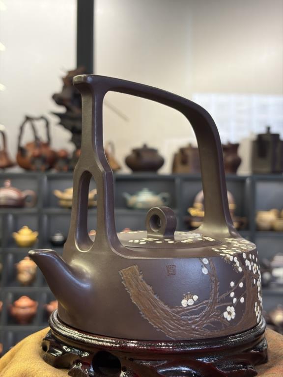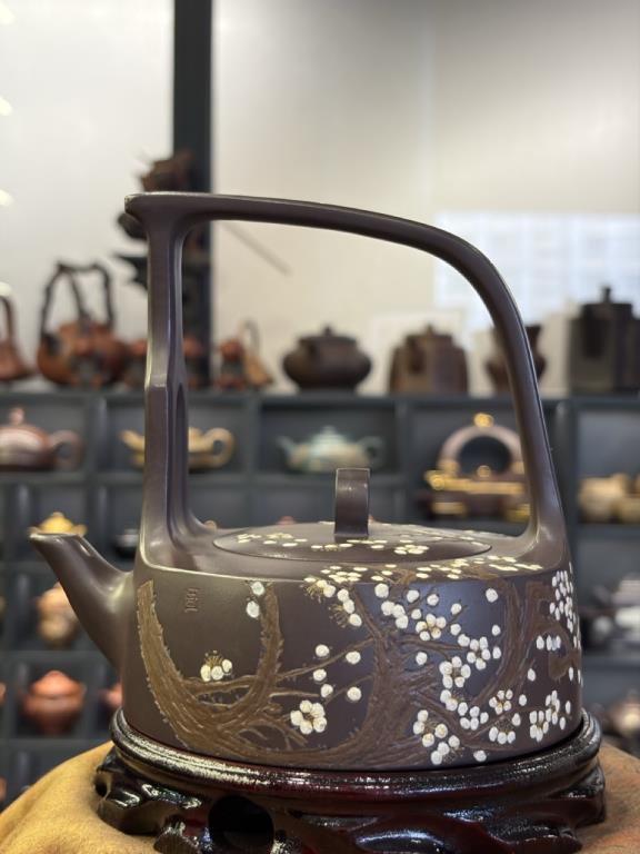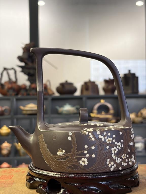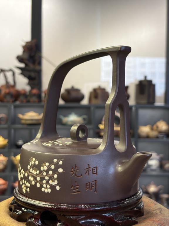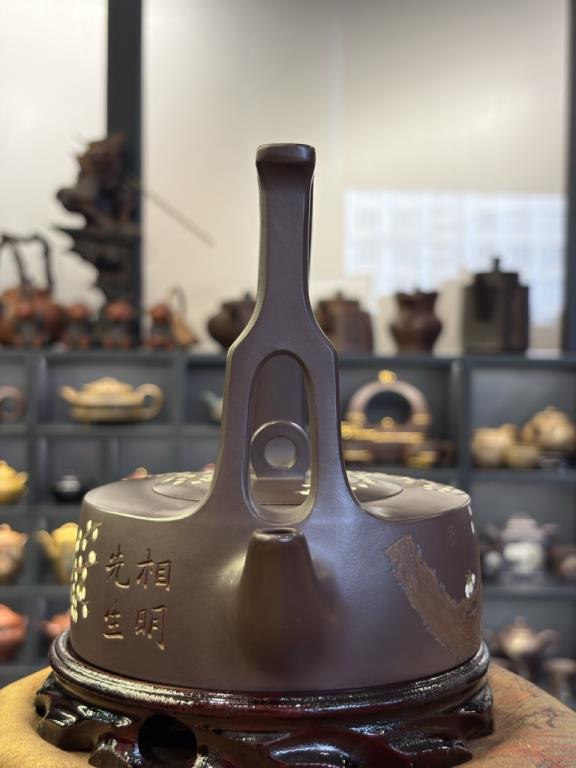 Đề Lương Ấm dung tích 340ml, chất đất Tử Nê (紫泥), được ghi niên đại cuối thập niên 1980 (八十年代末). Dáng đề lương lấy quai xách làm điểm nhấn, thiên về sự thuận tay khi nâng rót và khí tượng trang nhã, phù hợp cả thưởng trà lẫn trưng bày.