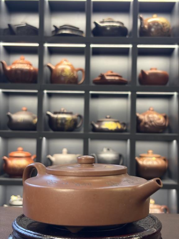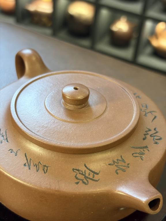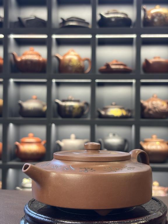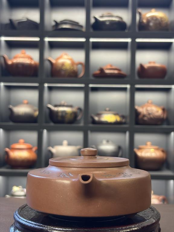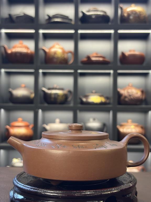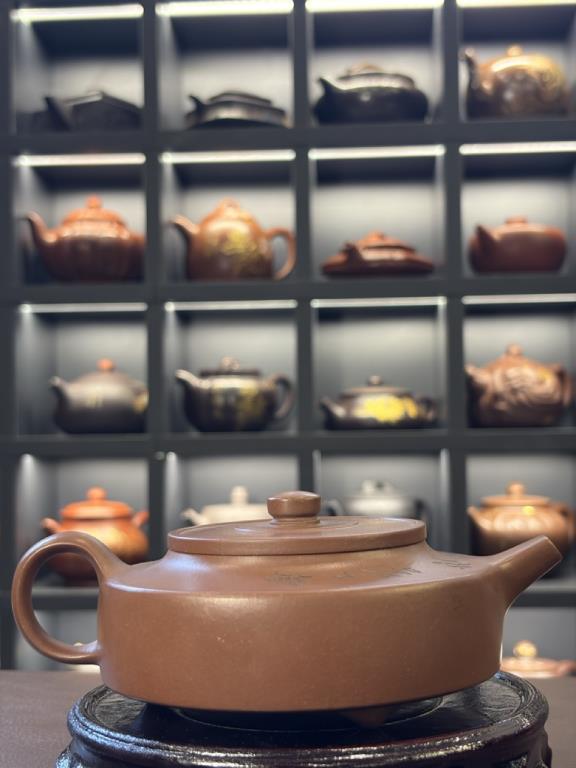 Lấy “la bàn” (罗盘) làm hình; vai gấp (折肩), cổ thấp (矮颈), miệng rộng (阔口), nắp phẳng (平盖). Trên nắp gia thêm một vòng chỉ tròn (一圈圆线). Vòi thẳng (直流) và quai vòng (环形把) ở hai bên thân ấm đối ứng từ xa, tạo thế cân xứng hài hòa.